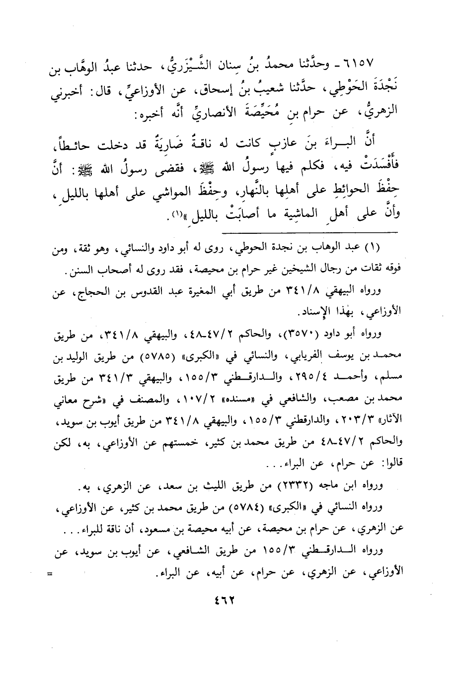 6157 - وَحَدَّثَنَا مُحَمَّدُ بْنُ سِنَانٍ الشَّيْزَرِيُّ، حَدَّثَنَا عَبْدُ الْوَهَّابِ بْنُ نَجْدَةَ الْحَوْطِيُّ، حَدَّثَنَا شُعَيْبُ بْنُ إِسْحَاقَ، عَنِ الْأَوْزَاعِيِّ قَالَ: أَخْبَرَنِي الزُّهْرِيُّ، عَنْ حَرَامِ بْنِ مُحَيِّصَةَ الْأَنْصَارِيِّ أَنَّهُ أَخْبَرَهُ: أَنَّ الْبَرَاءَ بْنَ عَازِبٍ كَانَتْ لَهُ نَاقَةٌ ضَارِيَةٌ قَدْ دَخَلَتْ حَائِطًا، فَأَفْسَدَتْ فِيهِ، فَكُلِّمَ فِيهَا رَسُولُ اللهِ صَلَّى اللَّهُ عَلَيْهِ وَسَلَّمَ، فَقَضَى رَسُولُ اللهِ صَلَّى اللَّهُ عَلَيْهِ وَسَلَّمَ: " أَنَّ حِفْظَ الْحَوَائِطِ عَلَى أَهْلِهَا بِالنَّهَارِ، وَحِفْظَ الْمَوَاشِي عَلَى أَهْلِهَا بِاللَّيْلِ، وَأَنَّ عَلَى أَهْلِ الْمَاشِيَةِ مَا أَصَابَتْ بِاللَّيْلِ " -[463]-
