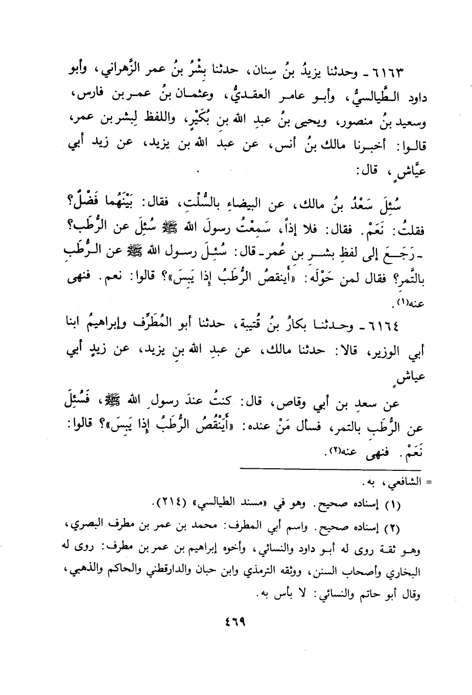 6164 - وَحَدَّثَنَا بَكَّارُ بْنُ قُتَيْبَةَ، حَدَّثَنَا أَبُو الْمُطَرِّفِ، وَإِبْرَاهِيمُ ابْنَا أَبِي الْوَزِيرِ قَالَا: حَدَّثَنَا مَالِكٌ، عَنْ عَبْدِ اللهِ بْنِ يَزِيدَ، عَنْ زَيْدِ أَبِي عَيَّاشٍ، عَنْ سَعْدِ بْنِ أَبِي وَقَّاصٍ قَالَ: كُنْتُ عِنْدَ رَسُولِ اللهِ صَلَّى اللَّهُ عَلَيْهِ وَسَلَّمَ، فَسُئِلَ عَنِ الرُّطَبِ بِالتَّمْرِ، فَسَأَلَ مَنْ عِنْدَهُ: " أَيَنْقُصُ الرُّطَبُ إِذَا يَبِسَ؟ " قَالُوا: نَعَمْ، فَنَهَى عَنْهُ "