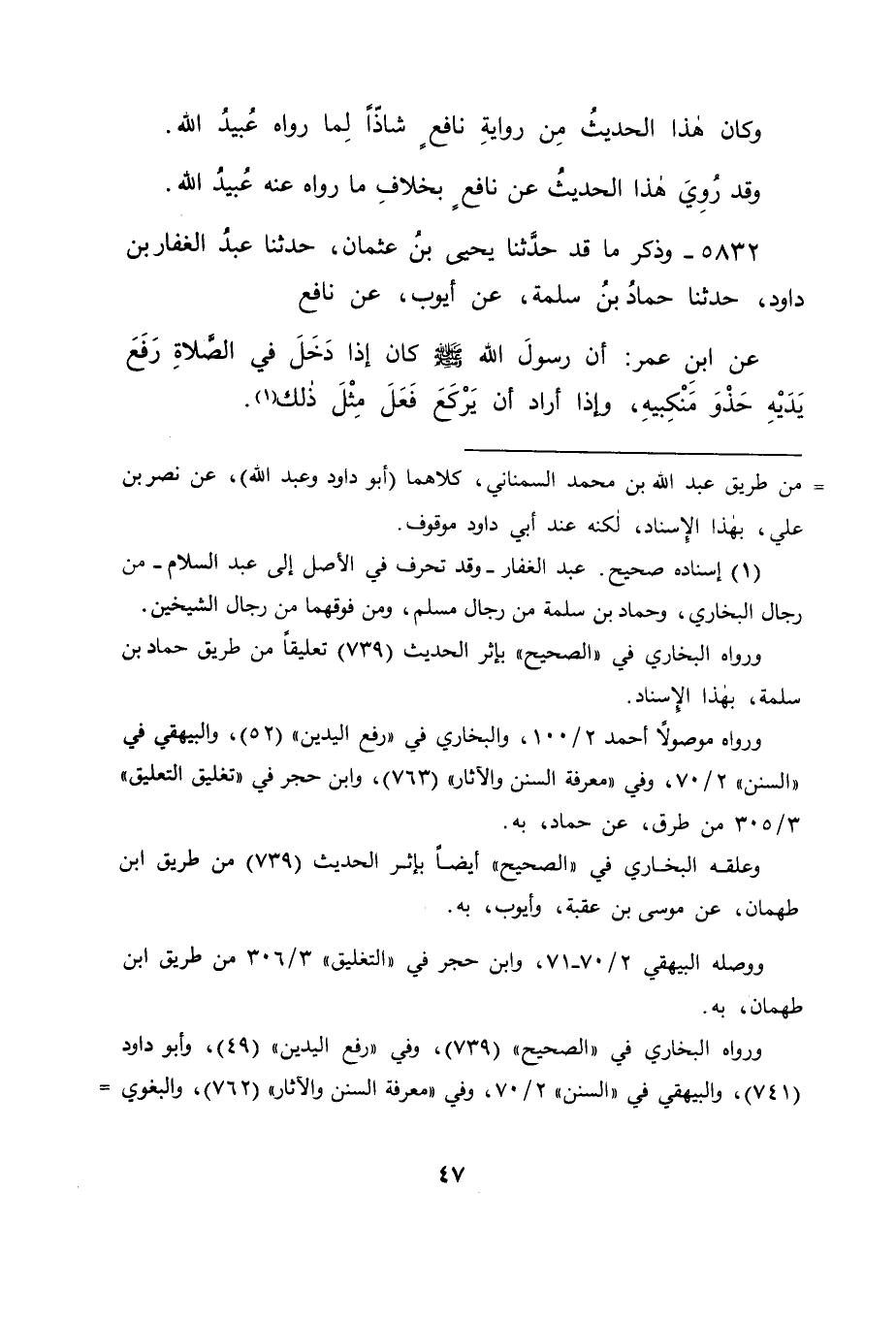 5832 - وَذَكَرَ مَا قَدْ حَدَّثَنَا يَحْيَى بْنُ عُثْمَانَ، حَدَّثَنَا عَبْدُ الْغَفَّارِ بْنُ دَاوُدَ، حَدَّثَنَا حَمَّادُ بْنُ سَلَمَةَ، عَنْ أَيُّوبَ، عَنْ نَافِعٍ، عَنِ ابْنِ عُمَرَ: أَنَّ رَسُولَ اللهِ صَلَّى اللَّهُ عَلَيْهِ وَسَلَّمَ كَانَ إِذَا دَخَلَ فِي الصَّلَاةِ رَفَعَ يَدَيْهِ حَذْوَ مَنْكِبَيْهِ، وَإِذَا أَرَادَ أَنْ يَرْكَعَ فَعَلَ مِثْلَ ذَلِكَ " -[48]- قَالَ: فَقَدْ وَافَقَ مَا رَوَاهُ مَالِكٌ، وَسُفْيَانُ، عَنِ الزُّهْرِيِّ، وَخَالَفَ مَا رَوَاهُ عُبَيْدُ اللهِ عَنْهُ. -[49]- فَكَانَ جَوَابُنَا لَهُ فِي ذَلِكَ: أَنَّ أَيُّوبَ مَا رَوَى شَيْئًا عَنْ نَافِعٍ مِمَّا رَوَاهُ عَنْهُ فِيهِ غَيْرُ أَيُّوبَ بِخِلَافِ مَا رَوَاهُ عُبَيْدُ اللهِ. وَمِمَّا يُحَقِّقُ مَا رَوَاهُ عُبَيْدُ اللهِ عَنْهُ فِي ذَلِكَ أَفْعَالُهُ الَّتِي كَانَ عَلَيْهَا فِي صَلَاتِهِ.