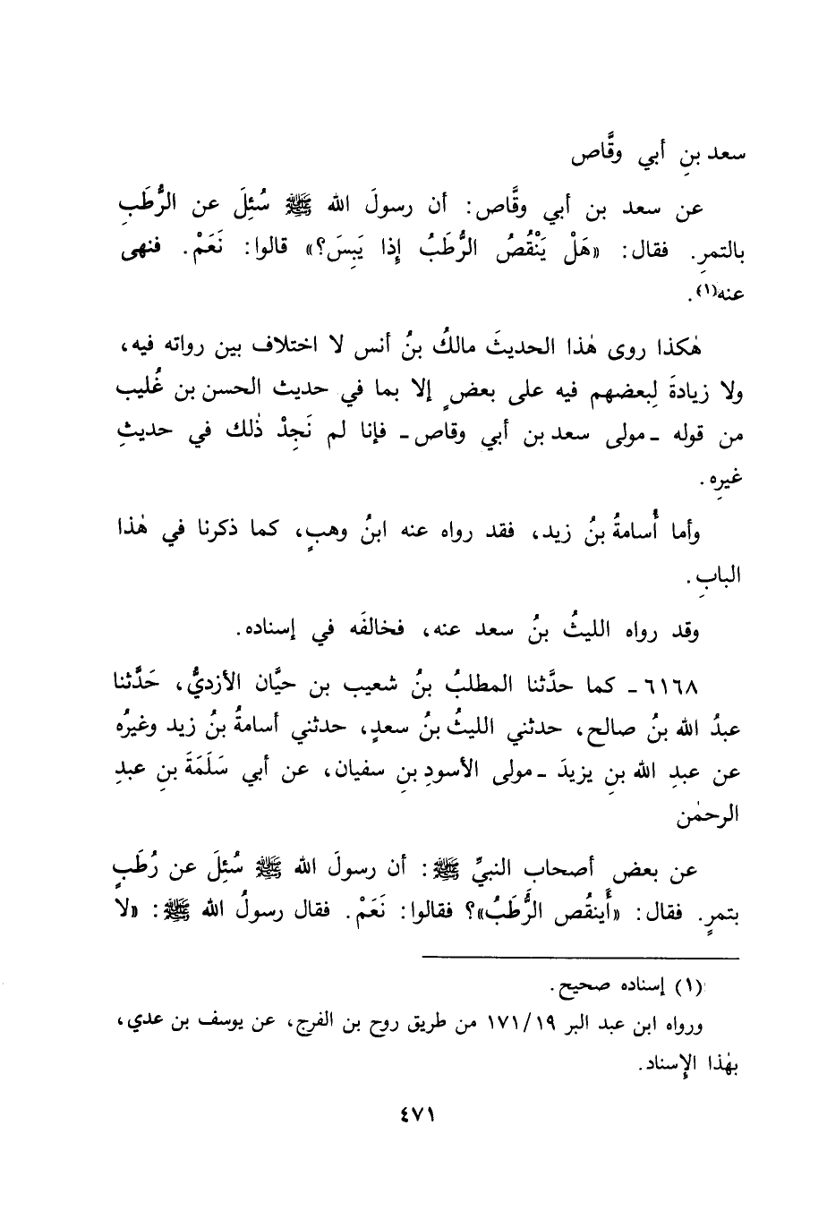 6168 - كَمَا حَدَّثَنَا الْمُطَّلِبُ بْنُ شُعَيْبِ بْنِ حَيَّانَ الْأَزْدِيُّ، حَدَّثَنَا عَبْدُ اللهِ بْنُ صَالِحٍ، حَدَّثَنِي اللَّيْثُ بْنُ سَعْدٍ، حَدَّثَنِي أُسَامَةُ بْنُ زَيْدٍ، وَغَيْرُهُ، عَنْ عَبْدِ اللهِ بْنِ يَزِيدَ مَوْلَى الْأَسْوَدِ بْنِ سُفْيَانَ، عَنْ أَبِي سَلَمَةَ بْنِ عَبْدِ الرَّحْمَنِ، عَنْ بَعْضِ أَصْحَابِ النَّبِيِّ صَلَّى اللَّهُ عَلَيْهِ وَسَلَّمَ: أَنَّ رَسُولَ اللهِ صَلَّى اللَّهُ عَلَيْهِ وَسَلَّمَ سُئِلَ عَنْ رُطَبِ بِتَمْرٍ فَقَالَ: " أَيَنْقُصُ الرُّطَبُ؟ " فَقَالُوا: نَعَمْ، فَقَالَ رَسُولُ اللهِ صَلَّى اللَّهُ عَلَيْهِ وَسَلَّمَ: " لَا -[472]- يُبَاعُ الرُّطَبُ بِالْيَابِسِ " فَاخْتَلَفَ اللَّيْثُ بْنُ سَعْدٍ، وَابْنُ وَهْبٍ عَلَى أُسَامَةَ فِي إِسْنَادِ هَذَا الْحَدِيثِ. ثُمَّ نَظَرْنَا: هَلْ رَوَى هَذَا الْحَدِيثَ عَنْ عَبْدِ اللهِ بْنِ يَزِيدَ غَيْرُهُمَا؟