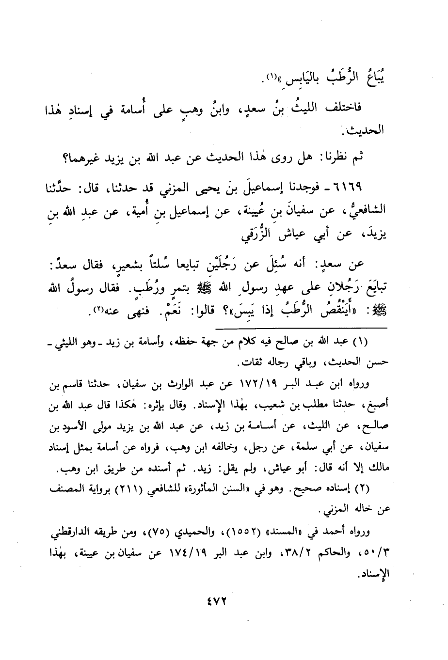 6169 - فَوَجَدْنَا إِسْمَاعِيلَ بْنَ يَحْيَى الْمُزَنِيَّ قَدْ حَدَّثَنَا قَالَ: حَدَّثَنَا الشَّافِعِيُّ، عَنْ سُفْيَانَ بْنِ عُيَيْنَةَ، عَنْ إِسْمَاعِيلَ بْنِ أُمَيَّةَ، عَنْ عَبْدِ اللهِ بْنِ يَزِيدَ، عَنْ أَبِي عَيَّاشٍ الزُّرَقِيِّ، عَنْ سَعْدٍ: أَنَّهُ سُئِلَ عَنْ رَجُلَيْنِ تَبَايَعَا سُلْتًا بِشَعِيرٍ، فَقَالَ سَعْدٌ: تَبَايَعَ رَجُلَانِ عَلَى عَهْدِ رَسُولِ اللهِ صَلَّى اللَّهُ عَلَيْهِ وَسَلَّمَ بِتَمْرٍ وَرُطَبٍ، فَقَالَ رَسُولُ اللهِ صَلَّى اللَّهُ عَلَيْهِ وَسَلَّمَ: " أَيَنْقُصُ الرُّطَبُ إِذَا يَبِسَ؟ " قَالُوا: نَعَمْ. فَنَهَى عَنْهُ " -[473]- هَكَذَا رَوَاهُ ابْنُ عُيَيْنَةَ، وَهَذَا مُحَالٌ، لِأَنَّ أَبَا عَيَّاشٍ الزُّرَقِيَّ رَجُلٌ مِنْ أَصْحَابِ النَّبِيِّ صَلَّى اللَّهُ عَلَيْهِ وَسَلَّمَ جَلِيلُ الْمِقْدَارِ، وَلَيْسَ لِعَبْدِ اللهِ بْنِ يَزِيدَ لِقَاءُ مِثْلِهِ، إِنَّمَا يَرْوِي عَنْ أَبِي سَلَمَةَ، وَأَمْثَالِهِ، وَهَذَا اضْطِرَابٌ شَدِيدٌ، وَلَا سِيَّمَا رَوَى الثَّوْرِيُّ هَذَا الْحَدِيثَ عَنْ إِسْمَاعِيلَ، عَنْ عَبْدِ اللهِ بْنِ يَزِيدَ، عَنْ رَجُلٍ لَمْ يُسَمِّهِ، غَيْرَ أَنَّ أَبَا حُذَيْفَةَ سَمَّاهُ.