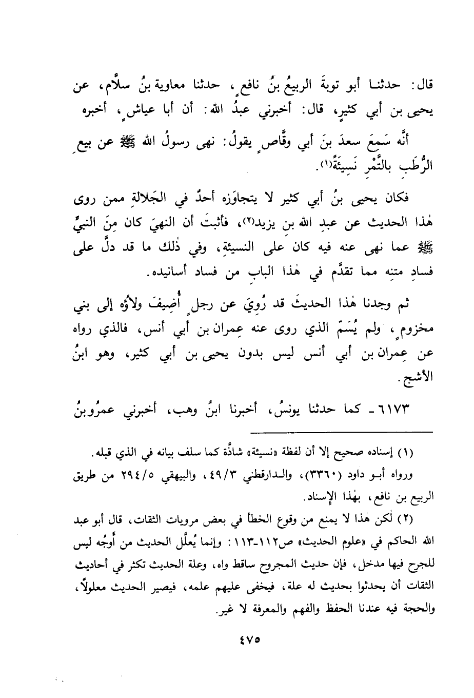 6173 - كَمَا حَدَّثَنَا يُونُسُ، أَخْبَرَنَا ابْنُ وَهْبٍ، أَخْبَرَنِي عَمْرُو بْنُ -[476]- الْحَارِثِ: أَنَّ بُكَيْرَ بْنَ عَبْدِ اللهِ بْنِ الْأَشَجِّ، حَدَّثَهُ عَنْ عِمْرَانَ بْنِ أَبِي أَنَسٍ، حَدَّثَهُ: أَنَّ مَوْلًى لِبَنِي مَخْزُومٍ حَدَّثَهُ: أَنَّهُ سَأَلَ سَعْدَ بْنَ أَبِي وَقَّاصٍ عَنِ الرَّجُلِ، يُسْلِفُ مِنَ الرَّجُلِ الرُّطَبَ بِالتَّمْرِ إِلَى أَجَلٍ، فَقَالَ سَعْدٌ: نَهَانَا رَسُولُ اللهِ صَلَّى اللَّهُ عَلَيْهِ وَسَلَّمَ عَنْ هَذَا " قَالَ بُكَيْرٌ: وَهَذَا نُنْهَى عَنْهُ. فَبَانَ بِحَمْدِ اللهِ وَنِعْمَتِهِ فَسَادُ هَذَا الْحَدِيثِ فِي إِسْنَادِهِ، وَفِي مَتْنِهِ جَمِيعًا، وَأَنَّهُ لَا حُجَّةَ عَلَى مَنْ خَالَفَهُ مِنْ أَبِي حَنِيفَةَ، وَمَنْ تَابَعَهُ عَلَى خِلَافِهِ فِيهِ. وَكَانَ الْقِيَاسُ أَيْضًا يُوجِبُهُ، لِأَنَّ السُّنَّةَ قَدْ أَجَازَتْ بَيْعَ الرُّطَبِ بِالرُّطَبِ مِثْلًا بِمِثْلٍ، وَلَمْ يُنْظَرْ فِي ذَلِكَ إِلَى مَا يَعُودُ إِلَيْهِ بِالْحُقُوقِ مِنَ الِاسْتِوَاءِ، وَمِنَ الِاخْتِلَافِ، فَدَلَّ ذَلِكَ أَنَّهُ كَذَلِكَ الرُّطَبُ بِالتَّمْرِ إِذَا بِيعَا مِثْلًا بِمِثْلٍ سَوَاءً بِسَوَاءٍ، أَنْ يَكُونَا جَائِزَيْنِ، وَأَنْ لَا يُنْظَرَ فِي ذَلِكَ إِلَى مَا يَعُودُ إِلَيْهِ الرُّطَبُ مِنْهَا بَعْدَ الْجُفُوفِ مِنَ النُّقْصَانِ عَنِ التَّمْرِ الْمَبِيعِ بِهِ، -[477]- وَأَجَازَتِ السُّنَّةُ أَيْضًا بَيْعَ التَّمْرِ بِالتَّمْرِ مِثْلًا بِمِثْلٍ، وَالْحِنْطَةَ بِالْحِنْطَةِ مِثْلًا بِمِثْلٍ، وَالشَّعِيرَ بِالشَّعِيرِ مِثْلًا بِمِثْلٍ، وَهِيَ أَشْيَاءُ مِمَّا يُحِيطُ الْعِلْمُ بِتَغَيُّرِهَا بَعْدَ الْبَيْعِ بِالْجُفُوفِ وَالنُّقْصَانِ، فَلَمْ يُنْظَرْ إِلَى ذَلِكَ فِيهَا، وَنُظِرَ إِلَى أَحْوَالِهَا الَّتِي تَكُونُ عَلَيْهَا يَوْمَ يَقَعُ الْبَيْعُ عَلَيْهَا، لَا مَا سِوَى ذَلِكَ مِنْهَا، مَعَ أَنَّ فِيَ فَسَادِ الْأَصْلِ الَّذِي تَعَلَّقَ بِهِ الذَّاهِبُونَ إِلَى ذَلِكَ الْقَوْلِ مَا يَقْطَعُ حَجَّتَهُمْ، وَيَمْنَعُ مَا كَانُوا يَحْتَجُّونَ بِهِ، مِمَّا بَانَ عَلَيْهِمْ فَسَادُهُ، كَمَا ذَكَرْنَا مِمَّا ذَكَرْنَا، وَبِاللهِ التَّوْفِيقُ.