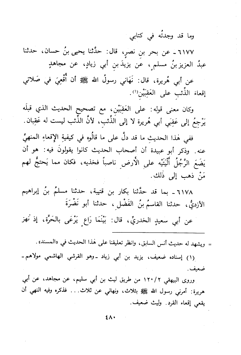 6177 - عَنْ بَحْرِ بْنِ نَصْرٍ قَالَ: حَدَّثَنَا يَحْيَى بْنُ حَسَّانَ، حَدَّثَنَا عَبْدُ الْعَزِيزِ بْنُ مُسْلِمٍ، عَنْ يَزِيدَ بْنِ أَبِي زِيَادٍ، عَنْ مُجَاهِدٍ، عَنْ أَبِي هُرَيْرَةَ قَالَ: نَهَانِي رَسُولُ اللهِ صَلَّى اللَّهُ عَلَيْهِ وَسَلَّمَ أَنْ أُقْعِيَ فِي صَلَاتِي إِقْعَاءَ الذِّئْبِ عَلَى الْعَقِبَيْنِ " وَكَانَ مَعْنَى قَوْلِهِ: عَلَى الْعَقِبَيْنِ، مَعَ تَصْحِيحِ الْحَدِيثِ الَّذِي قَبْلَهُ يَرْجِعُ إِلَى عَقِبَيْ أَبِي هُرَيْرَةَ، لَا إِلَى الذِّئْبِ، لِأَنَّ الذِّئْبَ لَيْسَتْ لَهُ عَقِبَانِ. فَفِي هَذَا الْحَدِيثِ مَا قَدْ دَلَّ عَلَى مَا قَالُوهُ فِي كَيْفِيَّةِ الْإِقْعَاءِ الْمَنْهِيِّ عَنْهُ، وَذَكَرَ أَبُو عُبَيْدَةَ أَنَّ أَصْحَابَ الْحَدِيثِ كَانُوا يَقُولُونَ فِيهِ: هُوَ أَنْ يَضَعَ الرَّجُلُ أَلْيَتَيْهِ عَلَى الْأَرْضِ نَاصِبًا فَخِذَيْهِ، فَكَانَ مِمَّا يُحْتَجُّ لَهُمْ مَنْ ذَهَبَ إِلَى ذَلِكَ