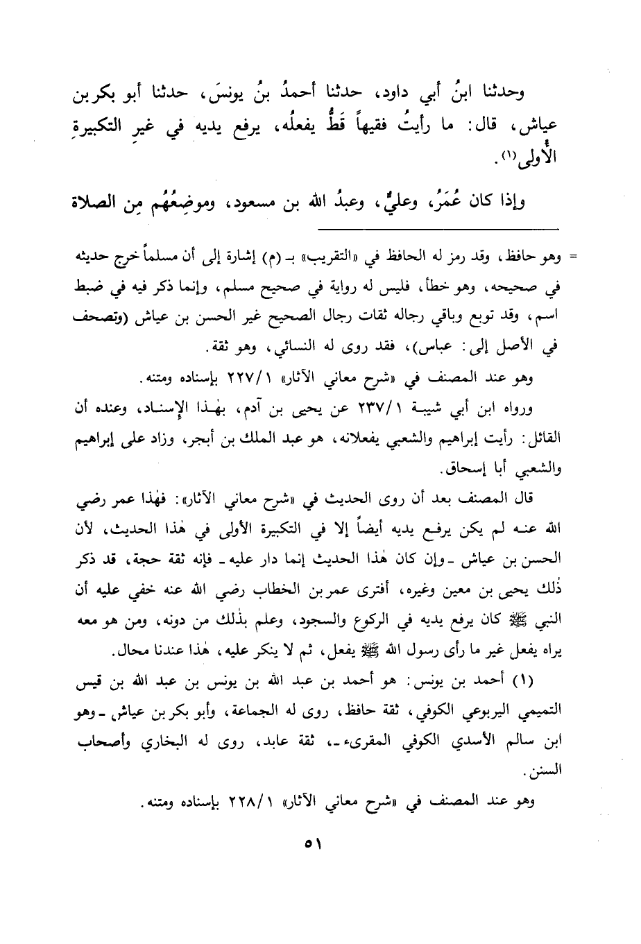 وَحَدَّثَنَا ابْنُ أَبِي دَاوُدَ، حَدَّثَنَا أَحْمَدُ بْنُ يُونُسَ، حَدَّثَنَا أَبُو بَكْرِ بْنُ عَيَّاشٍ قَالَ: مَا رَأَيْتُ فَقِيهًا قَطُّ يَفْعَلُهُ، يَرْفَعُ يَدَيْهِ فِي غَيْرِ التَّكْبِيرَةِ الْأُولَى " وَإِذَا كَانَ عُمَرُ، وَعَلِيُّ، وَعَبْدُ اللهِ بْنُ مَسْعُودٍ، وَمَوْضِعُهُمْ مِنَ الصَّلَاةِ -[52]- مَعَ رَسُولِ اللهِ صَلَّى اللَّهُ عَلَيْهِ وَسَلَّمَ مَوْضِعَ الْمُهَاجِرِينَ وَالْأَنْصَارِ، ثُمَّ ابْنُ عُمَرَ بَعْدَهُمْ عَلَى مِثْلِ ذَلِكَ لَمْ يَكُنْ شَيْءٌ مِمَّا رُوِيَ عَنِ النَّبِيِّ صَلَّى اللَّهُ عَلَيْهِ وَسَلَّمَ فِي الْقَبُولِ أَوْلَى مِمَّا رَوَوْهُ عَنْهُ