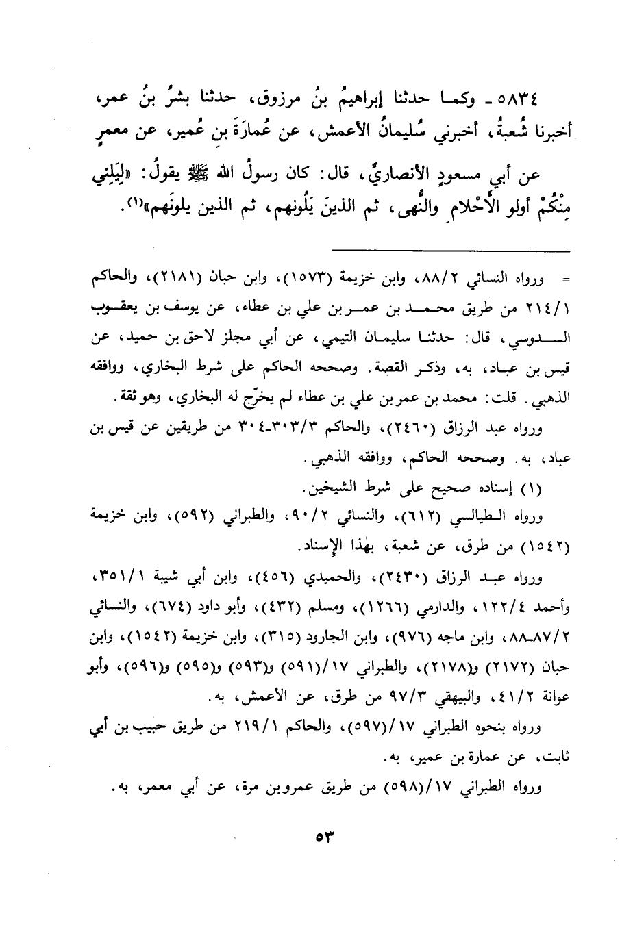 5834 - وَكَمَا حَدَّثَنَا إِبْرَاهِيمُ بْنُ مَرْزُوقٍ، حَدَّثَنَا بِشْرُ بْنُ عُمَرَ، أَخْبَرَنَا شُعْبَةُ، أَخْبَرَنِي سُلَيْمَانُ الْأَعْمَشُ، عَنْ عُمَارَةَ بْنِ عُمَيْرٍ، عَنْ مَعْمَرٍ، عَنْ أَبِي مَسْعُودٍ الْأَنْصَارِيِّ قَالَ: كَانَ رَسُولُ اللهِ صَلَّى اللَّهُ عَلَيْهِ وَسَلَّمَ يَقُولُ: " لِيَلِنِي مِنْكُمْ أُولُو الْأَحْلَامِ وَالنُّهَى، ثُمَّ الَّذِينَ يَلُونَهُمْ، ثُمَّ الَّذِينَ يَلُونَهُمْ "