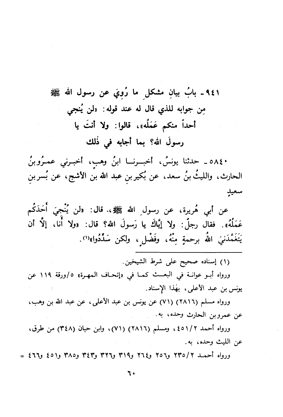 5840 - حَدَّثَنَا يُونُسُ، أَخْبَرَنَا ابْنُ وَهْبٍ، أَخْبَرَنِي عَمْرُو بْنُ الْحَارِثِ، وَاللَّيْثُ بْنُ سَعْدٍ، عَنْ بُكَيْرِ بْنِ عَبْدِ اللهِ بْنِ الْأَشَجِّ، عَنْ بُسْرِ بْنِ سَعِيدٍ، عَنْ أَبِي هُرَيْرَةَ، عَنْ رَسُولِ اللهِ صَلَّى اللَّهُ عَلَيْهِ وَسَلَّمَ قَالَ: " لَنْ يُنَجِّيَ أَحَدَكُمْ عَمَلُهُ ". فَقَالَ رَجُلٌ: وَلَا إِيَّاكَ يَا رَسُولَ اللهِ؟ قَالَ: " وَلَا أَنَا، إِلَّا أَنْ يَتَغَمَّدَنِيَ اللهُ بِرَحْمَةٍ مِنْهُ وَفَضْلٍ، وَلَكِنْ سَدِّدُوا " -[61]-
