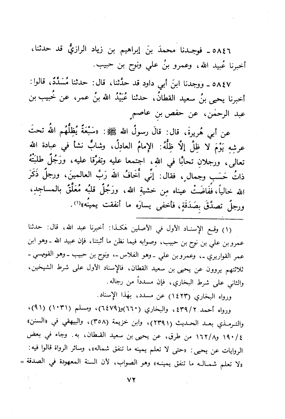 5847 - وَوَجَدْنَا ابْنَ أَبِي دَاوُدَ قَدْ حَدَّثَنَا قَالَ: حَدَّثَنَا مُسَدَّدٌ، قَالُوا: أَخْبَرَنَا يَحْيَى بْنُ سَعِيدٍ الْقَطَّانُ، حَدَّثَنَا عُبَيْدُ اللهِ بْنُ عُمَرَ، عَنْ خُبَيْبِ بْنِ عَبْدِ الرَّحْمَنِ، عَنْ حَفْصِ بْنِ عَاصِمٍ، عَنْ أَبِي هُرَيْرَةَ قَالَ: قَالَ رَسُولُ اللهِ صَلَّى اللَّهُ عَلَيْهِ وَسَلَّمَ: " سَبْعَةٌ يُظِلُّهُمُ اللهُ تَحْتَ عَرْشِهِ يَوْمَ لَا ظِلَّ إِلَّا ظِلُّهُ: الْإِمَامُ الْعَادِلُ، وَشَابٌّ نَشَأَ فِي عِبَادَةِ اللهِ تَعَالَى، وَرَجُلَانِ تَحَابَّا فِي اللهِ اجْتَمَعَا عَلَيْهِ وَتَفَرَّقَا عَلَيْهِ، وَرَجُلٌ طَلَبَتْهُ ذَاتُ حَسَبٍ وَجَمَالٍ فَقَالَ: إِنِّي أَخَافُ اللهَ رَبَّ الْعَالَمِينَ، وَرَجُلٌ ذَكَرَ اللهَ خَالِيًا فَفَاضَتْ عَيْنَاهُ مِنْ خَشْيَةِ اللهِ، وَرَجُلٌ قَلْبُهُ مُعَلَّقٌ بِالْمَسَاجِدِ، وَرَجُلٌ تَصَدَّقَ بِصَدَقَةٍ، فَأَخْفَى يَسَارَهُ مَا أَنْفَقَتْ يَمِينُهُ " -[73]- فَوَقَفْنَا بِذَلِكَ عَلَى أَنَّ عُبَيْدَ اللهِ لَمْ يُحَدِّثْ بِهَذَا الْحَدِيثِ عَنْ جَدِّهِ حَفْصِ بْنِ عَاصِمٍ بِسَمَاعِهِ كَانَ إِيَّاهُ مِنْهُ، وَعَلَى أَنَّ أَخْذَهُ إِيَّاهُ إِنَّمَا كَانَ مِنْ خُبَيْبِ بْنِ عَبْدِ الرَّحْمَنِ، عَنْ حَفْصِ بْنِ عَاصِمٍ. ثُمَّ نَظَرْنَا فِي الْأَصْلِ الْمَذْكُورِ فِي هَذَا الْحَدِيثِ مَا الْمُرَادُ بِهِ؟ فَلَمْ يَكُنْ فِي حَدِيثِ مَالِكٍ عَنْ خُبَيْبِ بْنِ عَبْدِ الرَّحْمَنِ مَا يَدُلُّ عَلَى ذَلِكَ، مَا هُوَ؟ وَهُوَ قَوْلُهُ: يُظِلُّهُمُ اللهُ فِي ظِلِّ عَرْشِهِ فَأَخْبَرَ بِذَلِكَ أَنَّ الظِّلَّ الْمُرَادَ فِي هَذَا الْحَدِيثِ هُوَ ظِلُّ عَرْشِ اللهِ عَزَّ وَجَلَّ. وَقَدْ رُوِيَ فِي مِثْلِ هَذَا الْمَعْنَى مِنَ الظِّلِّ الْمَذْكُورِ فِي كِتَابِ اللهِ عَزَّ وَجَلَّ: {وَظِلٍّ مَمْدُودٍ} [الواقعة: 30]