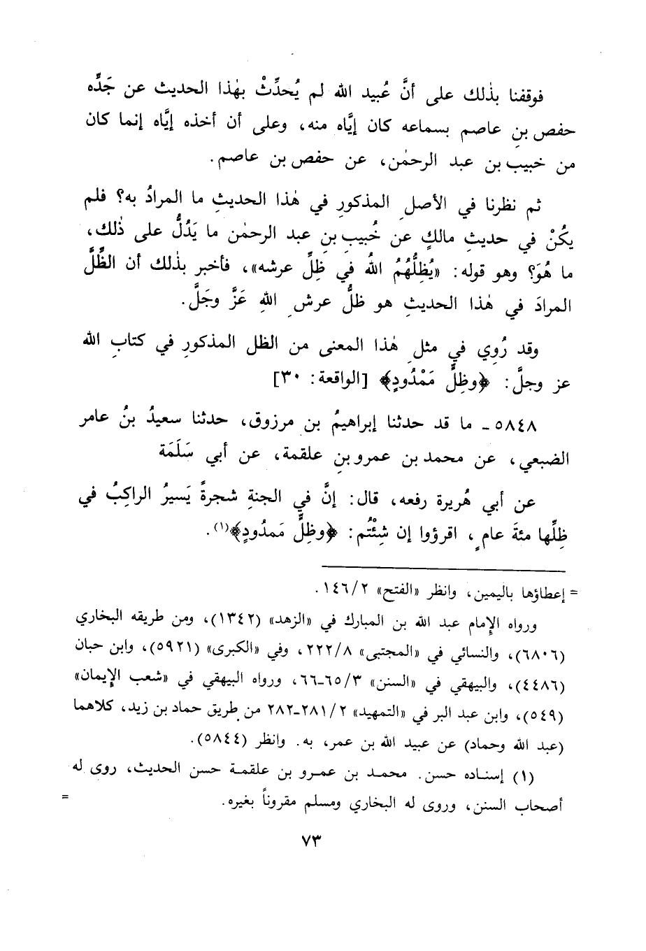 5848 - مَا قَدْ حَدَّثَنَا إِبْرَاهِيمُ بْنُ مَرْزُوقٍ، حَدَّثَنَا سَعِيدُ بْنُ عَامِرٍ الضُّبَعِيُّ، عَنْ مُحَمَّدِ بْنِ عَمْرِو بْنِ عَلْقَمَةَ، عَنْ أَبِي سَلَمَةَ، عَنْ أَبِي هُرَيْرَةَ رَفَعَهُ قَالَ: " إِنَّ فِي الْجَنَّةِ شَجَرَةً يَسِيرُ الرَّاكِبُ فِي ظِلِّهَا مِائَةَ عَامٍ، اقْرَءُوا إِنْ شِئْتُمْ: {وَظِلٍّ مَمْدُودٍ} [الواقعة: 30] " -[74]- وَكَانَ هَذَا الظِّلُّ خِلَافَ الظِّلِّ الْمَذْكُورِ فِي الْحَدِيثِ الْأَوَّلِ، ثُمَّ نَظَرْنَا فِي الظِّلِّ نَفْسِهِ، مَا هُوَ؟