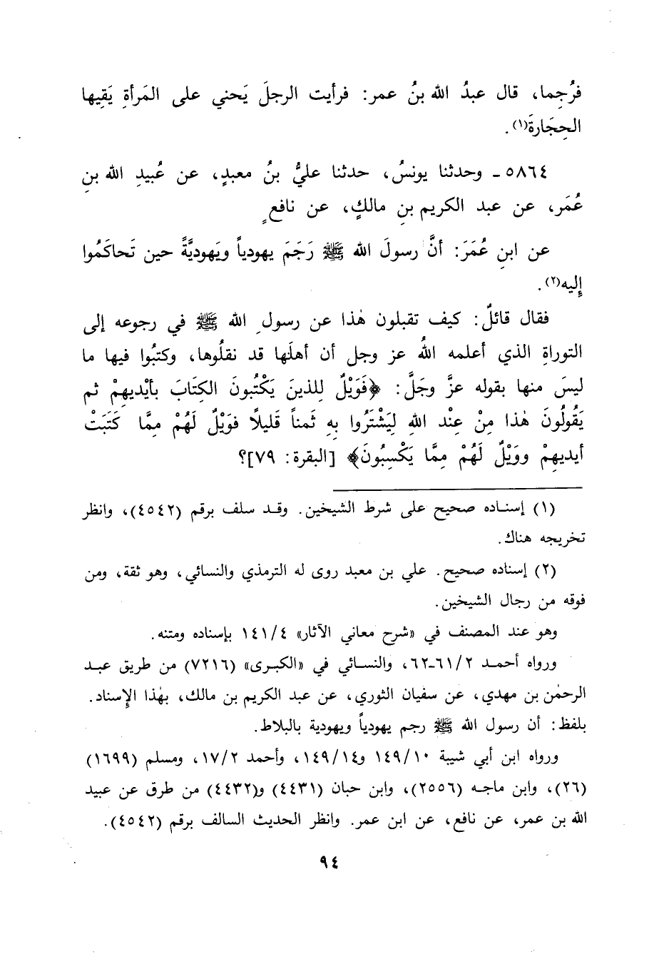 5864 - وَحَدَّثَنَا يُونُسُ، حَدَّثَنَا عَلِيُّ بْنُ مَعْبَدٍ، عَنْ عُبَيْدِ اللهِ بْنِ عُمَرَ، عَنْ عَبْدِ الْكَرِيمِ بْنِ مَالِكٍ، عَنْ نَافِعٍ، عَنِ ابْنِ عُمَرَ، " أَنَّ رَسُولَ اللهِ صَلَّى اللَّهُ عَلَيْهِ وَسَلَّمَ رَجَمَ يَهُودِيًّا وَيَهُودِيَّةً حِينَ تَحَاكَمُوا إِلَيْهِ " فَقَالَ قَائِلٌ: كَيْفَ تَقْبَلُونَ هَذَا عَنْ رَسُولِ اللهِ صَلَّى اللَّهُ عَلَيْهِ وَسَلَّمَ فِي رُجُوعِهِ إِلَى التَّوْرَاةِ الَّذِي أَعْلَمَهُ اللهُ عَزَّ وَجَلَّ أَنَّ أَهْلَهَا قَدْ نَقَلُوهَا، وَكَتَبُوا فِيهَا مَا لَيْسَ مِنْهَا، بِقَوْلِهِ عَزَّ وَجَلَّ: {فَوَيْلٌ لِلَّذِينَ يَكْتُبُونَ الْكِتَابَ بِأَيْدِيهِمْ ثُمَّ يَقُولُونَ هَذَا مِنْ عِنْدِ اللهِ لِيَشْتَرُوا بِهِ ثَمَنًا قَلِيلًا فَوَيْلٌ لَهُمْ مِمَّا كَتَبَتْ أَيْدِيهِمْ وَوَيْلٌ لَهُمْ مِمَّا يَكْسِبُونَ} [البقرة: 79]-[95]- فَكَانَ جَوَابُنَا لَهُ فِي ذَلِكَ: أَنَّ رَسُولَ اللهِ صَلَّى اللَّهُ عَلَيْهِ وَسَلَّمَ إِنَّمَا كَانَ فَعَلَ ذَلِكَ لِإِعْلَامِ اللهِ إِيَّاهُ أَنَّ الرَّجْمَ فِي التَّوْرَاةِ مِمَّا أَخْفَاهُ الْيَهُودُ مِنْهَا وَلَمْ يُبْدُوهُ، فَأَمَرَهُمْ بِالْإِتْيَانِ بِهَا لِذَلِكَ، لِيُقِيمَ عَلَيْهِمُ الْحُجَّةَ، وَلِيُلْزِمَهُمُ الْوَاجِبَ بِالتَّوْرَاةِ عَلَيْهِمَا، إِذْ كَانَ مِنْهُمْ مِثْلُ الَّذِي كَانَ فِي الَّذِينَ تَحَاكَمُوا إِلَيْهِ.