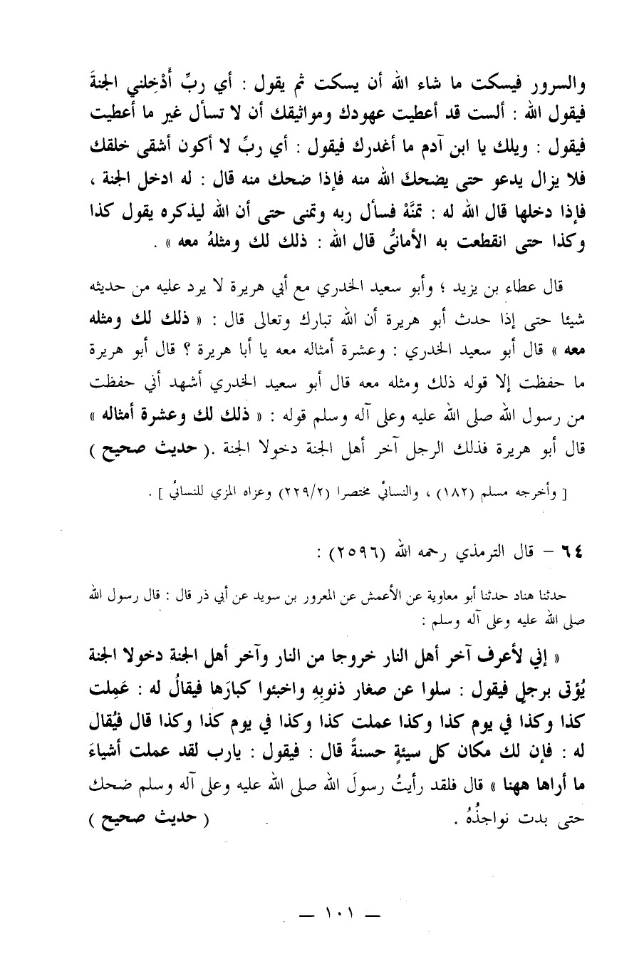 وَالسُّرُورِ فَيَسْكُتُ مَا شَاءَ اللَّهُ أَنْ يَسْكُتَ، ثُمَّ يَقُولُ: أَيْ رَبِّ أَدْخِلْنِي الْجَنَّةَ فَيَقُولُ اللَّهُ: أَلَسْتَ قَدْ أَعْطَيْتَ عُهُودَكَ وَمَوَاثِيقَكَ أَنْ لَا تَسْأَلَ غَيْرَ مَا أُعْطِيتَ، فَيَقُولُ: وَيْلَكَ يَا ابْنَ آدَمَ مَا أَغْدَرَكَ، فَيَقُولُ: أَيْ رَبِّ لَا أَكُونَنَّ أَشْقَى خَلْقِكَ فَلَا يَزَالُ يَدْعُو حَتَّى يَضْحَكَ اللَّهُ مِنْهُ، فَإِذَا ضَحِكَ مِنْهُ قَالَ لَهُ: ادْخُلْ الْجَنَّةَ، فَإِذَا دَخَلَهَا قَالَ اللَّهُ لَهُ: تَمَنَّهْ، فَسَأَلَ رَبَّهُ وَتَمَنَّى حَتَّى إِنَّ اللَّهَ لَيُذَكِّرُهُ يَقُولُ: كَذَا وَكَذَا حَتَّى انْقَطَعَتْ بِهِ الْأَمَانِيُّ قَالَ اللَّهُ: ذَلِكَ لَكَ وَمِثْلُهُ مَعَهُ)) . قَالَ عَطَاءُ بْنُ يَزِيدَ: وَأَبُو سَعِيدٍ لْخُدْريُّ مَعَ أَبِي هُرَيْرَةَ، لَا يَرُدُّ عَلَيْهِ مِنْ حَدِيثِهِ شَيْئًا, حَتَّى إِذَا حَدَّثَ أَبُو هُرَيْرَةَ أَنَّ اللَّهَ تَبَارَكَ وَتَعَالَى قَالَ: ((ذَلِكَ لَكَ وَمِثْلُهُ مَعَهُ)) . قَالَ أَبُو سَعِيدٍ الْخُدْرِيُّ: وَعَشَرَةُ أَمْثَالِهِ مَعَهُ يَا أَبَا هُرَيْرَةَ؟ قَالَ أَبُو هُرَيْرَة: َ مَا حَفِظْتُ إِلَّا قَوْلَهُ: ذَلِكَ لَكَ وَمِثْلُهُ مَعَهُ، قَالَ أَبُو سَعِيدٍ الْخُدْرِيُّ: أَشْهَدُ أَنِّي حَفِظْتُ مِنْ رَسُولِ اللَّهِ صلى الله عليه وسلم قَوْلَهُ: ((ذَلِكَ لَكَ وَعَشَرَةُ أَمْثَالِهِ)) . قَالَ أَبُو هُرَيْرَةَ: فَذَلِكَ الرَّجُلُ آخِرُ أَهْلِ الْجَنَّةِ دُخُولاً الْجَنَّةَ.