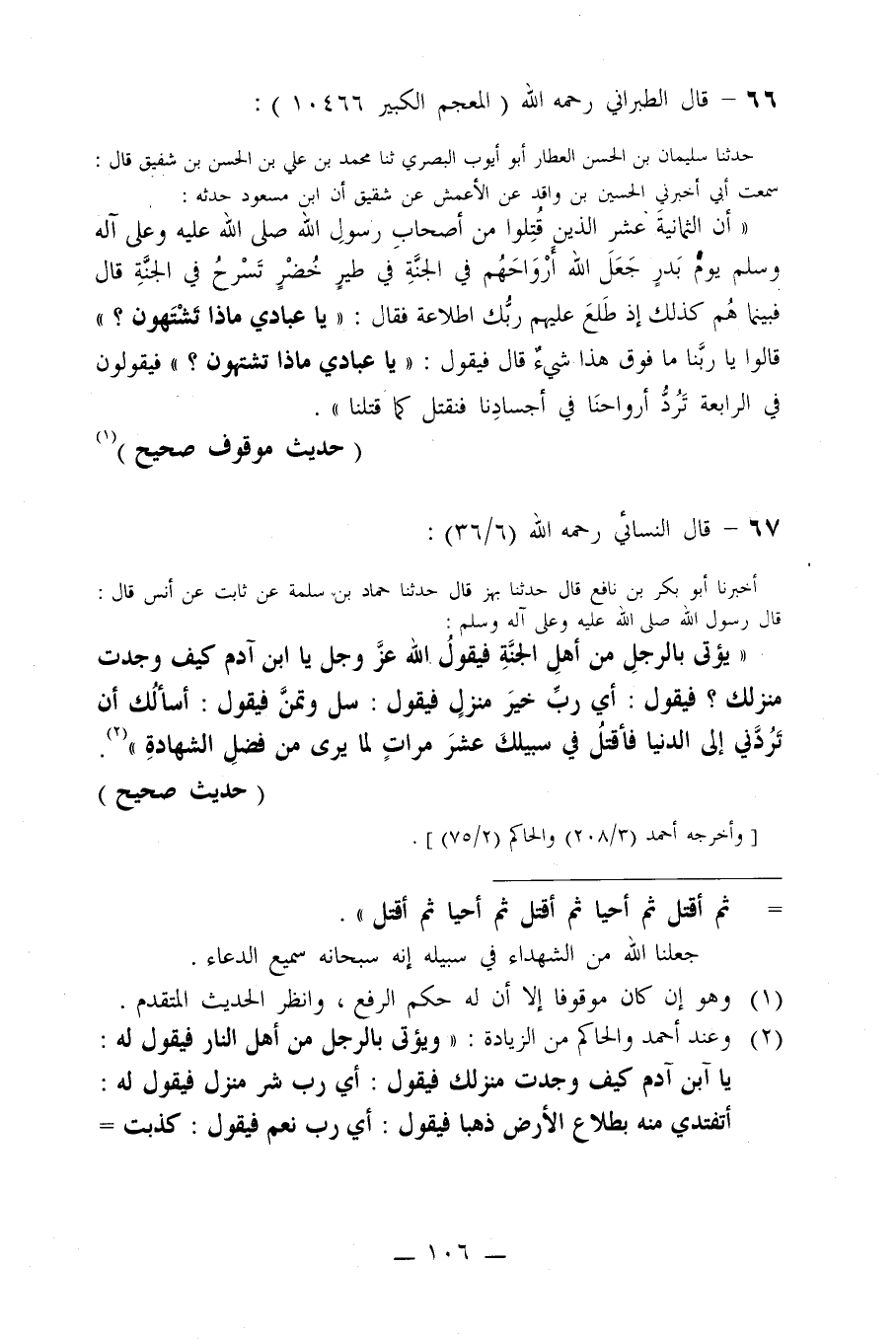 ((يا عِبَاديّ مَاذَا تَشْتَهون؟)) فيقولون في الرابعة: تَرُدُّ أرواحنا في أجسادِنا فنقتل كما قتلنا)) .