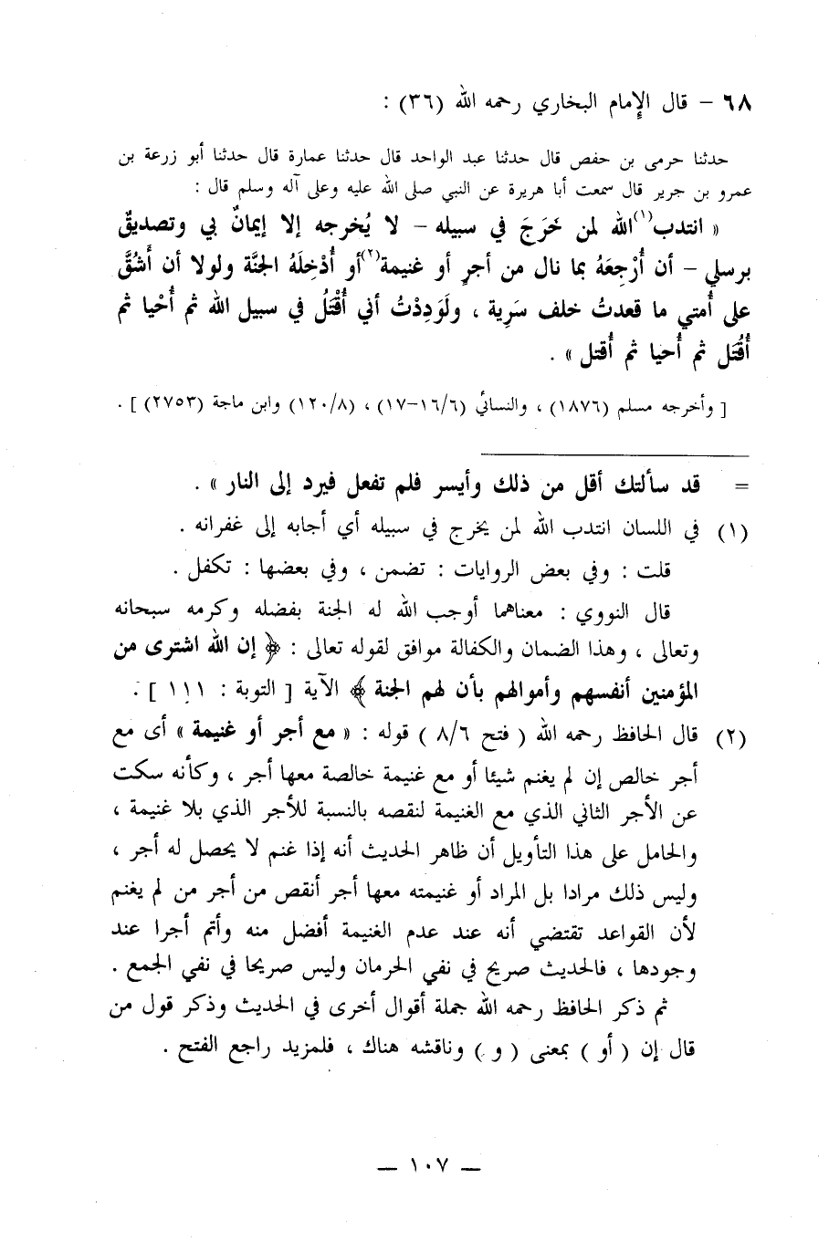 61- عَنْ أبي هُرَيْرَةَ عَنْ النَّبِيِّ صلى الله عليه وسلم قَالَ: ((انْتَدَبَ اللَّهُ لِمَنْ خَرَجَ فِي سَبِيلِهِ -لَا يُخْرِجُهُ إِلَّا إِيمَانٌ بِي وَتَصْدِيقٌ بِرُسُلِي- أَنْ أُرْجِعَهُ بِمَا نَالَ مِنْ أَجْرٍ أَوْ غَنِيمَةٍ أَوْ أُدْخِلَهُ الْجَنَّةَ، وَلَوْلَا أَنْ أَشُقَّ عَلَى أُمَّتِي مَا قَعَدْتُ خَلْفَ سَرِيَّةٍ وَلَوَدِدْتُ أَنِّي أُقْتَلُ فِي سَبِيلِ اللَّهِ, ثُمَّ أُحْيَا ثُمَّ أُقْتَلُ ثُمَّ أُحْيَا ثُمَّ أُقْتَلُ)) .