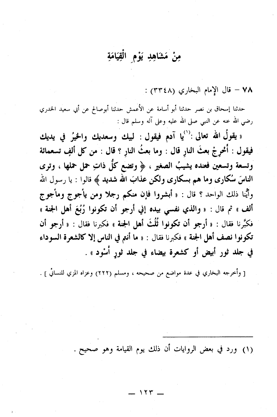70- عَنْ أَبِي سَعِيدٍ الْخُدْرِيِّ (عَنْ النَّبِيِّ صلى الله عليه وسلم قَالَ: ((يَقُولُ اللَّهُ تَعَالَى: يَا آدَمُ، فَيَقُولُ: لَبَّيْكَ وَسَعْدَيْكَ وَالْخَيْرُ فِي يَدَيْكَ، فَيَقُولُ: أَخْرِجْ بَعْثَ النَّارِ. قَالَ: وَمَا بَعْثُ النَّارِ؟ قَالَ: مِنْ كُلِّ أَلْفٍ تِسْعَ مِائَةٍ وَتِسْعَةً وَتِسْعِينَ فَعِنْدَهُ يَشِيبُ الصَّغِيرُ، (وَتَضَعُ كُلُّ ذَاتِ حَمْلٍ حَمْلَهَا وَتَرَى النَّاسَ سُكَارَى وَمَا هُمْ بِسُكَارَى وَلَكِنَّ عَذَابَ اللَّهِ شَدِيدٌ (, قَالُوا: يَا رَسُولَ اللَّهِ وَأَيُّنَا ذَلِكَ الْوَاحِدُ؟ قَالَ: ((أَبْشِرُوا؛ فَإِنَّ مِنْكُمْ رَجُلاً، وَمِنْ يَأْجُوجَ وَمَأْجُوجَ أَلْفًا، ثُمَّ قَالَ: وَالَّذِي نَفْسِي بِيَدِهِ إِنِّي أَرْجُو أَنْ تَكُونُوا رُبُعَ أَهْلِ الْجَنَّةِ)) ، فَكَبَّرْنَا فَقَالَ: ((أَرْجُو أَنْ تَكُونُوا ثُلُثَ أَهْلِ الْجَنَّةِ)) ، فَكَبَّرْنَا فَقَالَ: ((أَرْجُو أَنْ تَكُونُوا نِصْفَ أَهْلِ الْجَنَّةِ)) , فَكَبَّرْنَا فَقَالَ: ((مَا أَنْتُمْ فِي النَّاسِ إِلَّا كَالشَّعَرَةِ السَّوْدَاءِ فِي جِلْدِ ثَوْرٍ أَبْيَضَ أَوْ كَشَعَرَةٍ بَيْضَاءَ فِي جِلْدِ ثَوْرٍ أَسْوَدَ)) .