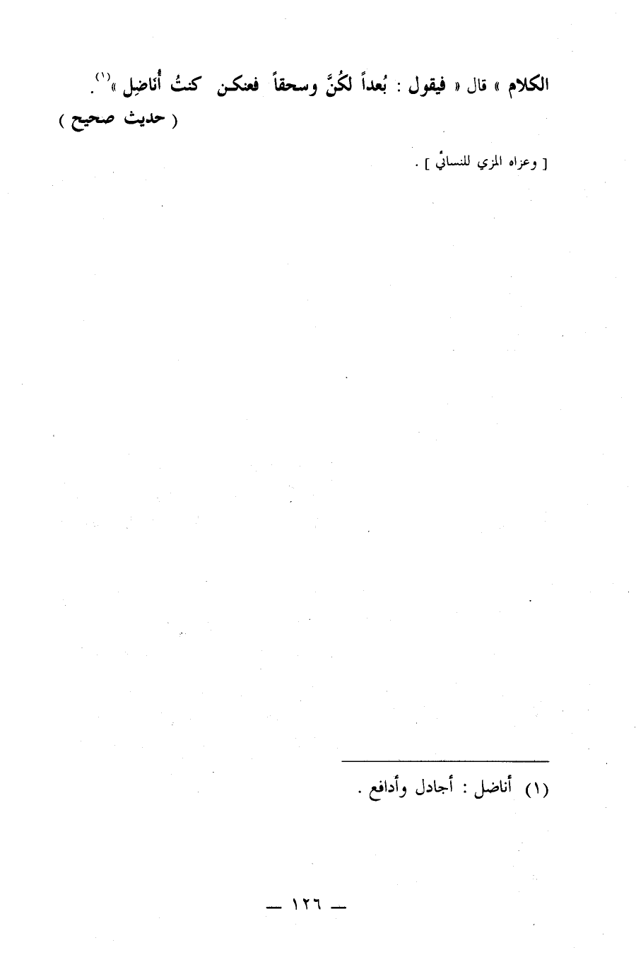 الْكَلَام)) قَالَ: ((فَيَقُولُ: بُعْدًا لَكُنَّ وَسُحْقًا فَعَنْكُنَّ كُنْتُ أُنَاضِلُ)) .