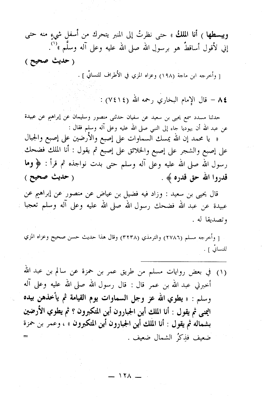 وَيَبْسُطُهَا) أَنَا الْمَلِكُ)) حَتَّى نَظَرْتُ إِلَى الْمِنْبَرِ يَتَحَرَّكُ مِنْ أَسْفَلِ شَيْءٍ مِنْهُ حَتَّى إِنِّي لَأَقُولُ أَسَاقِطٌ هُوَ بِرَسُولِ اللَّهِ صلى الله عليه وسلم.