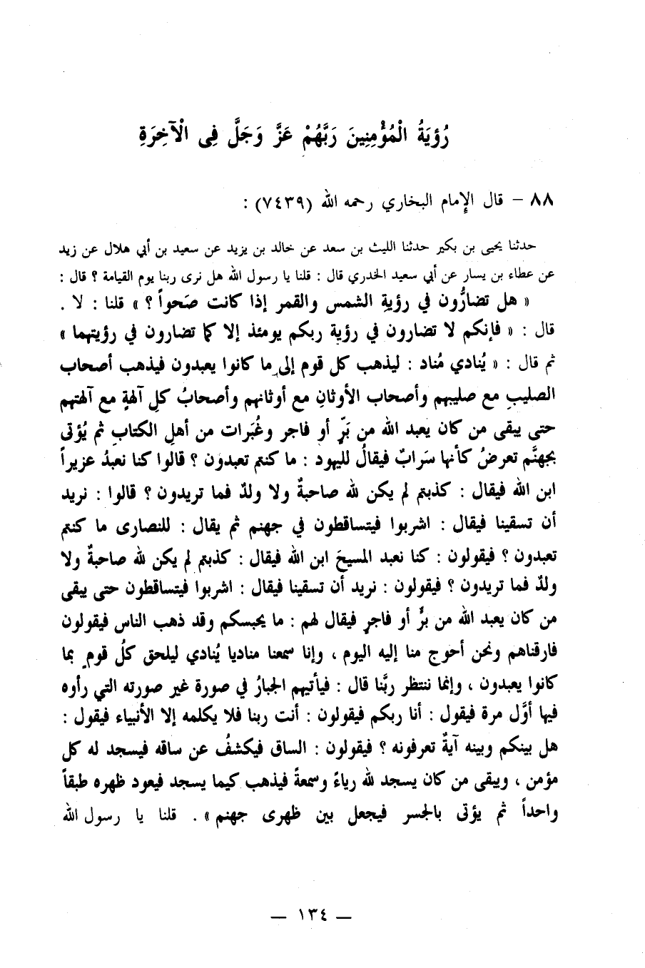 79- عَنْ أَبِي سَعِيدٍ الْخُدْرِيِّ (قَال: َ قُلْنَا يَا رَسُولَ اللَّهِ هَلْ نَرَى رَبَّنَا يَوْمَ الْقِيَامَةِ؟ قَالَ: ((هَلْ تُضَارُونَ فِي رُؤْيَةِ الشَّمْسِ وَالْقَمَرِ إِذَا كَانَتْ صَحْوًا؟)) قُلْنَا: لَا. قَالَ: ((فَإِنَّكُمْ لَا تُضَارُونَ فِي رُؤْيَةِ رَبِّكُمْ يَوْمَئِذٍ إِلَّا كَمَا تُضَارُونَ فِي رُؤْيَتِهِمَا)) ثُمَّ قَالَ: ((يُنَادِي مُنَادٍ: لِيَذْهَبْ كُلُّ قَوْمٍ إِلَى مَا كَانُوا يَعْبُدُونَ؛ فَيَذْهَبُ أَصْحَابُ الصَّلِيبِ مَعَ صَلِيبِهِمْ، وَأَصْحَابُ الْأَوْثَانِ مَعَ أَوْثَانِهِمْ، وَأَصْحَابُ كُلِّ آلِهَةٍ مَعَ آلِهَتِهِم، ْ حَتَّى يَبْقَى مَنْ كَانَ يَعْبُدُ اللَّهَ مِنْ بَرٍّ أَوْ فَاجِرٍ وَغُبَّرَاتٌ مِنْ أَهْلِ الْكِتَابِ، ثُمَّ يُؤْتَى بِجَهَنَّمَ تُعْرَضُ كَأَنَّهَا سَرَابٌ فَيُقَالُ لِلْيَهُودِ: مَا كُنْتُمْ تَعْبُدُونَ؟ قَالُوا: كُنَّا نَعْبُدُ عُزَيْرًا ابْنَ اللَّهِ فَيُقَال: ُ كَذَبْتُمْ لَمْ يَكُنْ لِلَّهِ صَاحِبَةٌ وَلَا وَلَدٌ فَمَا تُرِيدُونَ؟ قَالُوا: نُرِيدُ أَنْ تَسْقِيَنَا فَيُقَالُ: اشْرَبُوا فَيَتَسَاقَطُونَ فِي جَهَنَّمَ، ثُمَّ يُقَالُ: لِلنَّصَارَى مَا كُنْتُمْ تَعْبُدُونَ؟ فَيَقُولُونَ: كُنَّا نَعْبُدُ الْمَسِيحَ ابْنَ اللَّهِ فَيُقَالُ: كَذَبْتُمْ لَمْ يَكُنْ لِلَّهِ صَاحِبَةٌ وَلَا وَلَدٌ فَمَا تُرِيدُونَ؟ فَيَقُولُونَ: نُرِيدُ أَنْ تَسْقِيَنَا فَيُقَالُ: اشْرَبُوا، فَيَتَسَاقَطُونَ فِي جَهَنَّمَ حَتَّى يَبْقَى مَنْ كَانَ يَعْبُدُ اللَّهَ مِنْ بَرٍّ أَوْ فَاجِرٍ فَيُقَالُ لَهُمْ: مَا يَحْبِسُكُمْ وَقَدْ ذَهَبَ النَّاسُ فَيَقُولُونَ: فَارَقْنَاهُمْ وَنَحْنُ أَحْوَجُ مِنَّا إِلَيْهِ الْيَوْمَ، وَإِنَّا سَمِعْنَا مُنَادِيًا يُنَادِي: لِيَلْحَقْ كُلُّ قَوْمٍ بِمَا كَانُوا يَعْبُدُونَ، وَإِنَّمَا نَنْتَظِرُ رَبَّنَا قَالَ: فَيَأْتِيهِمْ الْجَبَّارُ فِي صُورَةٍ غَيْرِ صُورَتِهِ الَّتِي رَأَوْهُ فِيهَا أَوَّلَ مَرَّةٍ، فَيَقُولُ: أَنَا رَبُّكُمْ، فَيَقُولُون: َ أَنْتَ رَبُّنَا فَلَا يُكَلِّمُهُ إِلَّا الْأَنْبِيَاءُ، فَيَقُولُ: هَلْ بَيْنَكُمْ وَبَيْنَهُ آيَةٌ تَعْرِفُونَهُ؟ فَيَقُولُونَ: السَّاقُ فَيَكْشِفُ عَنْ سَاقِهِ فَيَسْجُدُ لَهُ كُلُّ مُؤْمِن، ٍ وَيَبْقَى مَنْ كَانَ يَسْجُدُ لِلَّهِ رِيَاءً وَسُمْعَةً فَيَذْهَبُ كَيْمَا يَسْجُدَ فََعُودُ َهْرُهُ َبَقًا َاحِدًا ثُمَّ يُؤْتَى بِالْجَسْرِ فَيُجْعَلُ بَيْنَ ظَهْرَيْ جَهَنَّمَ)) قُلْنَا: يَا رَسُولَ اللَّهِ