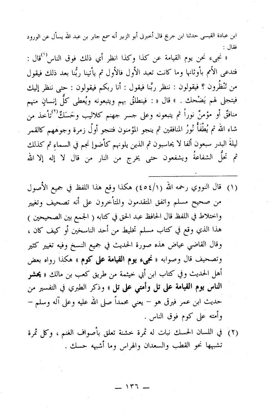 80- عَنْ أبي الزُّبَيْرِ أَنَّهُ سَمِعَ جَابِرَ بْنَ عَبْدِ اللَّهِ -رضي الله عنه- يُسْأَلُ عَنْ الْوُرُودِ فَقَالَ: ((نَجِيءُ نَحْنُ يَوْمَ الْقِيَامَةِ عَنْ كَذَا وَكَذَا انْظُرْ أَيْ ذَلِكَ فَوْقَ النَّاسِ، قَالَ: فَتُدْعَى الْأُمَمُ بِأَوْثَانِهَا وَمَا كَانَتْ تَعْبُدُ، الْأَوَّلُ فَالْأَوَّلُ ثُمَّ يَأْتِينَا رَبُّنَا بَعْدَ ذَلِكَ فَيَقُولُ: مَنْ تَنْظُرُونَ؟ فَيَقُولُونَ: نَنْظُرُ رَبَّنَا فَيَقُولُ: أَنَا رَبُّكُمْ فَيَقُولُونَ: حَتَّى نَنْظُرَ إِلَيْكَ فَيَتَجَلَّى لَهُمْ يَضْحَكُ)) . قَال: َ ((فَيَنْطَلِقُ بِهِمْ وَيَتَّبِعُونَهُ، وَيُعْطَى كُلُّ إِنْسَانٍ مِنْهُمْ -مُنَافِقٍ أَوْ مُؤْمِنٍ- نُورًا ثُمَّ يَتَّبِعُونَهُ، وَعَلَى جِسْرِ جَهَنَّمَ كَلَالِيبُ وَحَسَكٌ تَأْخُذُ مَنْ شَاءَ اللَّهُ ثُمَّ يُطْفَأُ نُورُ الْمُنَافِقِينَ، ثُمَّ يَنْجُو الْمُؤْمِنُونَ فَتَنْجُو أَوَّلُ زُمْرَةٍ وُجُوهُهُمْ كَالْقَمَرِ لَيْلَةَ الْبَدْر، ِ سَبْعُونَ أَلْفًا لَا يُحَاسَبُونَ ثُمَّ الَّذِينَ يَلُونَهُمْ كَأَضْوَإِ نَجْمٍ فِي السَّمَاءِ، ثُمَّ كَذَلِكَ ثُمَّ تَحِلُّ الشَّفَاعَةُ، وَيَشْفَعُونَ حَتَّى يَخْرُجَ مِنْ النَّارِ مَنْ قَالَ: لَا إِلَهَ إِلَّا اللَّهُ