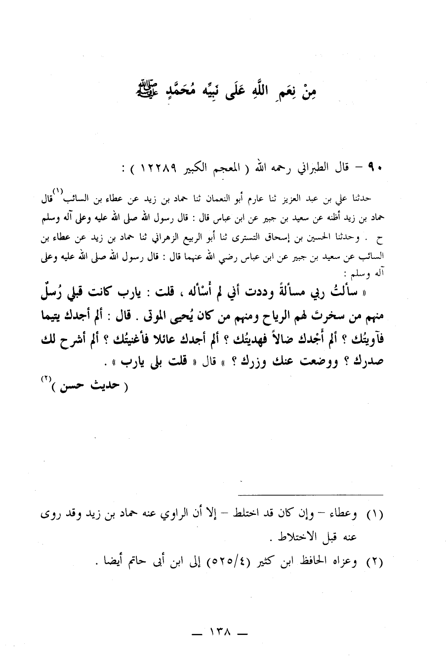 81- عن ابن عباس -رضي الله عنه- قال: قال رسول الله صلى الله عليه وسلم: ((سألتُ ربي مسألةً وددت أني لم أسأله، قلت: يا رب كانت قبلي رسلٌ منهم من سخرت لهم الرياح، ومنهم من كان يُحي الموتى. قال: ألم أجدك يتيمًا فأويتك؟ ألم أجدك ضالاً فهديتُك؟ ألم أجدك عائلاً فأغنيتُك؟ ألم أشرح لك صدرك؟ ووضعت عنك وزرك؟ قال: قلت: بلى يا رب)) .