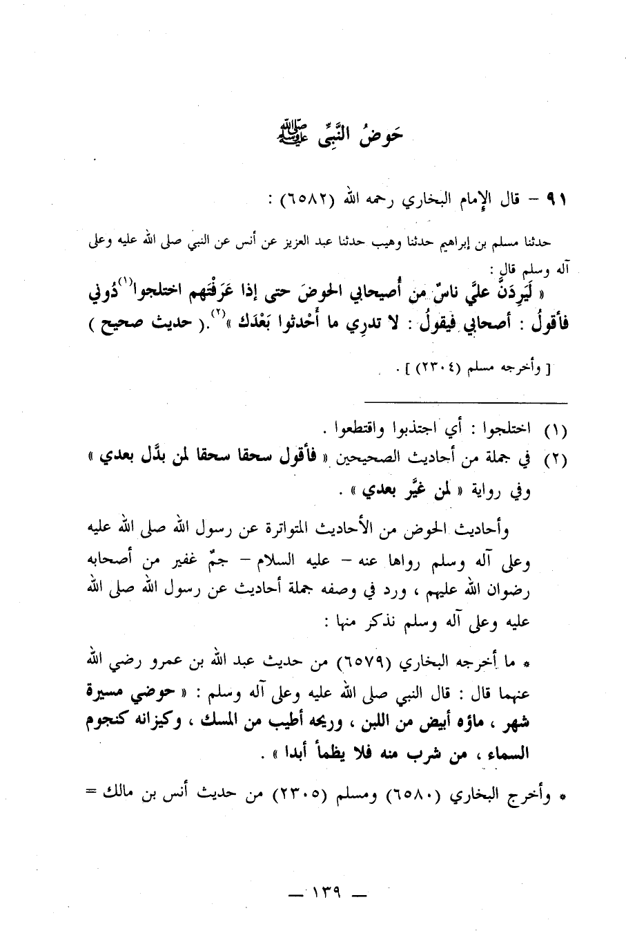 82- عَنْ أَنَسٍ (عَنْ النَّبِيِّ صلى الله عليه وسلم قَالَ: ((لَيَرِدَنَّ عَلَيَّ نَاسٌ مِنْ أَصْحَابِي الْحَوْضَ حَتَّى، عَرَفْتُهُمْ اخْتُلِجُوا دُونِي فَأَقُولُ: أَصْحَابِي, فَيَقُولُ: لَا تَدْرِي مَا أَحْدَثُوا بَعْدَكَ)) .
