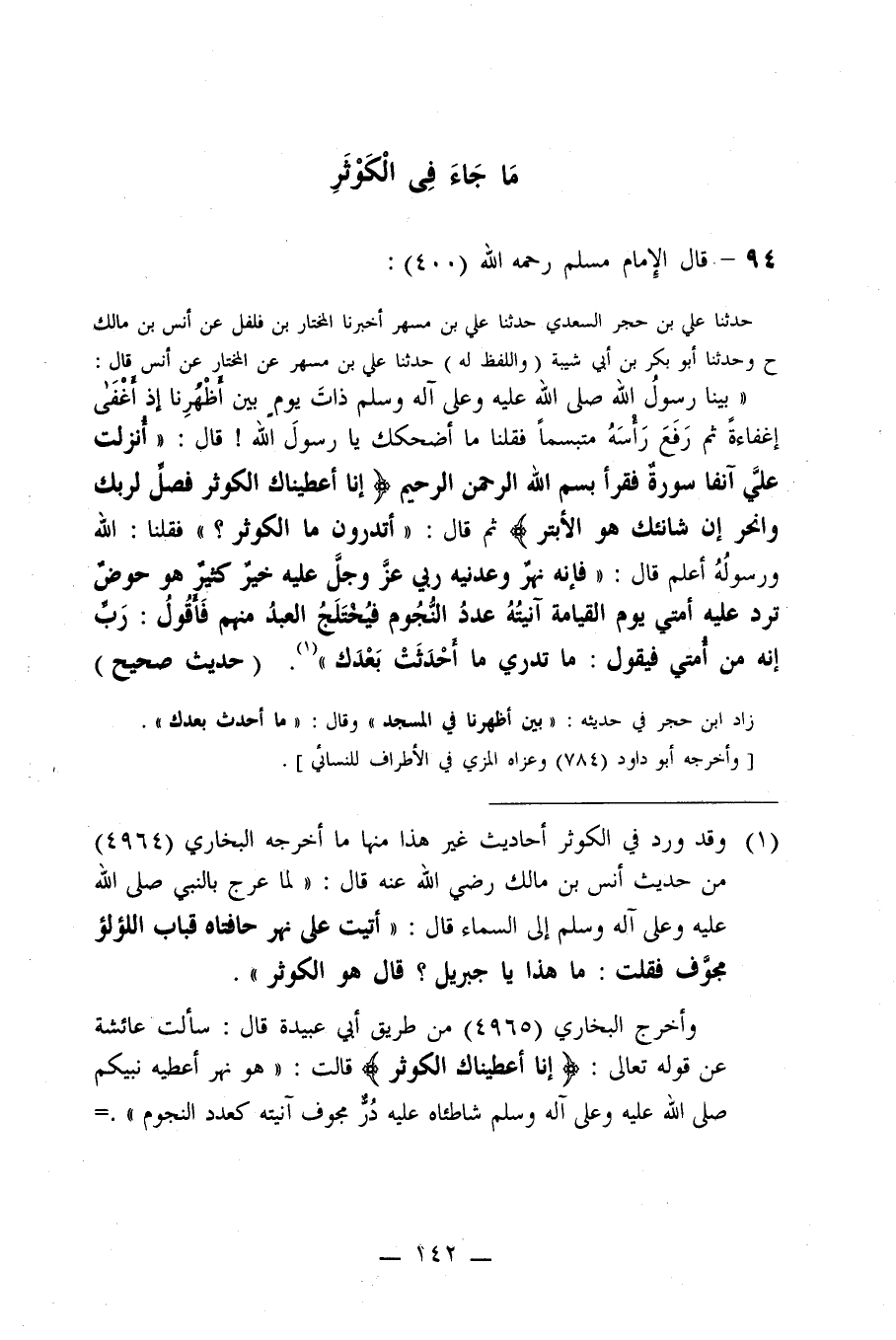 84- عَنْ أَنَسِ بْنِ مَالِكٍ (قَالَ: بَيْنَا رَسُولُ اللَّهِ صلى الله عليه وسلم ذَاتَ يَوْمٍ بَيْنَ أَظْهُرِنَا إِذْ أَغْفَى إِغْفَاءَةً ثُمَّ رَفَعَ رَأْسَهُ مُتَبَسِّمًا، فَقُلْنَا: مَا أَضْحَكَكَ يَا رَسُولَ اللَّهِ؟! قَالَ: ((أُنْزِلَتْ عَلَيَّ آنِفًا سُورَةٌ فَقَرَأَ: بِسْمِ اللَّهِ الرَّحْمَنِ الرَّحِيمِ (إِنَّا أَعْطَيْنَاكَ الْكَوْثَرَ. فَصَلِّ لِرَبِّكَ وَانْحَرْ. إِنَّ شَانِئَكَ هُوَ الْأَبْتَرُ (ثُمَّ قَالَ: أَتَدْرُونَ مَا الْكَوْثَرُ؟)) فَقُلْنَا: اللَّهُ وَرَسُولُهُ أَعْلَمُ قَالَ: ((فَإِنَّهُ نَهْرٌ وَعَدَنِيهِ رَبِّي -عَزَّ وَجَلَّ- عَلَيْهِ خَيْرٌ كَثِيرٌ هُوَ حَوْضٌ تَرِدُ عَلَيْهِ أُمَّتِي يَوْمَ الْقِيَامَةِ آنِيَتُهُ عَدَدُ النُّجُومِ فَيُخْتَلَجُ الْعَبْدُ مِنْهُمْ فَأَقُولُ: رَبِّ إِنَّهُ مِنْ أُمَّتِي فَيَقُولُ: مَا تَدْرِي مَا أَحْدَثَتْ بَعْدَكَ)) .