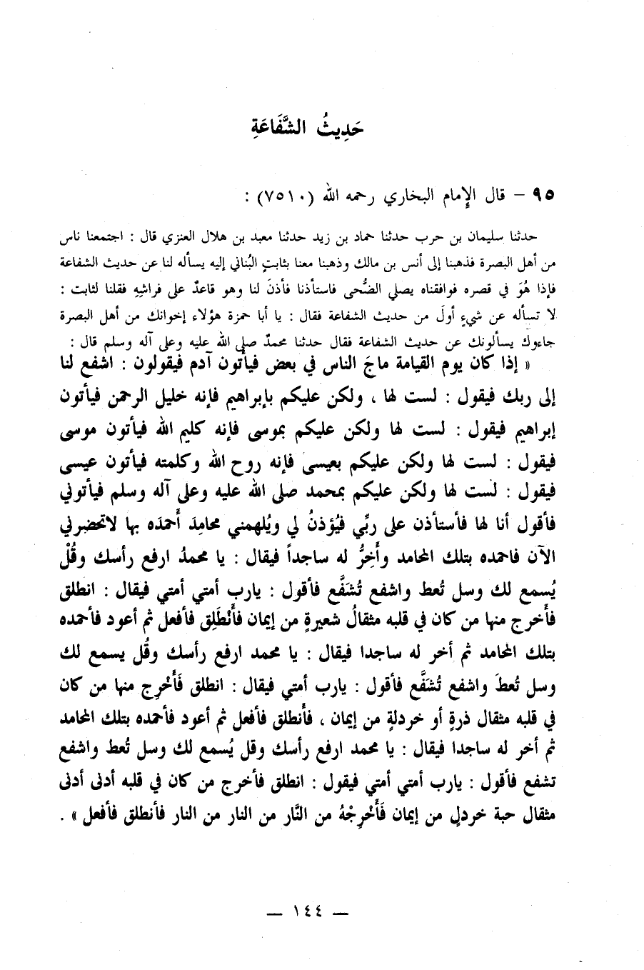85- عَنْ مَعْبَدُ بْنُ هِلَالٍ الْعَنَزِيُّ قَالَ: اجْتَمَعْنَا -نَاسٌ مِنْ أَهْلِ الْبَصْرَةِ- فَذَهَبْنَا إِلَى أَنَسِ بْنِ مَالِكٍ، وَذَهَبْنَا مَعَنَا بِثَابِتٍ الْبُنَانِيِّ إِلَيْهِ يَسْأَلُهُ لَنَا عَنْ حَدِيثِ الشَّفَاعَةِ، فَإِذَا هُوَ فِي قَصْرِهِ فَوَافَقْنَاهُ يُصَلِّي الضُّحَى فَاسْتَأْذَنَّا فَأَذِنَ لَنَا وَهُوَ قَاعِدٌ عَلَى فِرَاشِهِ، فَقُلْنَا لِثَابِتٍ: لَا تَسْأَلْهُ عَنْ شَيْءٍ أَوَّلَ مِنْ حَدِيثِ الشَّفَاعَةِ فَقَالَ: يَا أَبَا حَمْزَةَ هَؤُلَاءِ إِخْوَانُكَ مِنْ أَهْلِ الْبَصْرَةِ جَاءُوكَ يَسْأَلُونَكَ عَنْ حَدِيثِ الشَّفَاعَةِ فَقَالَ: حَدَّثَنَا مُحَمَّدٌ صلى الله عليه وسلم قَالَ: ((إِذَا كَانَ يَوْمُ الْقِيَامَةِ مَاجَ النَّاسُ بَعْضُهُمْ فِي بَعْضٍ فَيَأْتُونَ آدَمَ فَيَقُولُونَ: اشْفَعْ لَنَا إِلَى رَبِّكَ فَيَقُولُ: لَسْتُ لَهَا، وَلَكِنْ عَلَيْكُمْ بِإِبْرَاهِيمَ فَإِنَّهُ خَلِيلُ الرَّحْمَنِ، فَيَأْتُونَ إِبْرَاهِيمَ فَيَقُولُ: لَسْتُ لَهَا، وَلَكِنْ عَلَيْكُمْ بِمُوسَى فَإِنَّهُ كَلِيمُ اللَّهِ، فَيَأْتُونَ مُوسَى فَيَقُولُ: لَسْتُ لَهَا، وَلَكِنْ عَلَيْكُمْ بِعِيسَى فَإِنَّهُ رُوحُ اللَّهِ وَكَلِمَتُهُ، فَيَأْتُونَ عِيسَى فَيَقُولُ: لَسْتُ لَهَا، وَلَكِنْ عَلَيْكُمْ بِمُحَمَّدٍ صلى الله عليه وسلم، فَيَأْتُونِي فَأَقُولُ: أَنَا لَهَا فَأَسْتَأْذِنُ عَلَى رَبِّي فَيُؤْذَنُ لِي وَيُلْهِمُنِي مَحَامِدَ أَحْمَدُهُ بِهَا لَا تَحْضُرُنِي الْآنَ، فَأَحْمَدُهُ بِتِلْكَ الْمَحَامِدِ وَأَخِرُّ لَهُ سَاجِدًا فَيَقُولُ: يَا مُحَمَّدُ ارْفَعْ رَأْسَكَ، وَقُلْ يُسْمَعْ لَكَ، وَسَلْ تُعْطَ، وَاشْفَعْ تُشَفَّعْ، فَأَقُولُ: يَا رَبِّ أُمَّتِي أُمَّتِي فَيَقُولُ: انْطَلِقْ فَأَخْرِجْ مِنْهَا مَنْ كَانَ فِي قَلْبِهِ مِثْقَالُ شَعِيرَةٍ مِنْ إِيمَانٍ، فَأَنْطَلِقُ فَأَفْعَلُ، ثُمَّ أَعُودُ فَأَحْمَدُهُ بِتِلْكَ الْمَحَامِدِ ثُمَّ أَخِرُّ لَهُ سَاجِدًا فَيُقَالُ: يَا مُحَمَّدُ ارْفَعْ رَأْسَكَ، وَقُلْ يُسْمَعْ لَكَ، وَسَلْ تُعْطَ، وَاشْفَعْ تُشَفَّعْ، فَأَقُولُ: يَا رَبِّ أُمَّتِي أُمَّتِي فَيَقُولُ: انْطَلِقْ فَأَخْرِجْ مِنْهَا مَنْ كَانَ فِي قَلْبِهِ مِثْقَالُ ذَرَّةٍ أَوْ خَرْدَلَةٍ مِنْ إِيمَانٍ، فَأَخْرِجْهُ فَأَنْطَلِقُ فَأَفْعَلُ ثُمَّ أَعُودُ فَأَحْمَدُهُ بِتِلْكَ الْمَحَامِدِ ثُمَّ أَخِرُّ لَهُ سَاجِدًا, فَيَقُولُ: يَا مُحَمَّدُ ارْفَعْ رَأْسَكَ، وَقُلْ يُسْمَعْ لَكَ، وَسَلْ تُعْطَ، وَاشْفَعْ تُشَفَّعْ، فَأَقُولُ يَا رَبِّ أُمَّتِي أُمَّتِي فَيَقُولُ: انْطَلِقْ فَأَخْرِجْ مَنْ كَانَ فِي قَلْبِهِ أَدْنَى أَدْنَى أَدْنَى مِثْقَالِ حَبَّةِ خَرْدَلٍ مِنْ إِيمَانٍ، فَأَخْرِجْهُ مِنْ النَّارِ فَأَنْطَلِقُ فَأَفْعَلُ)) .