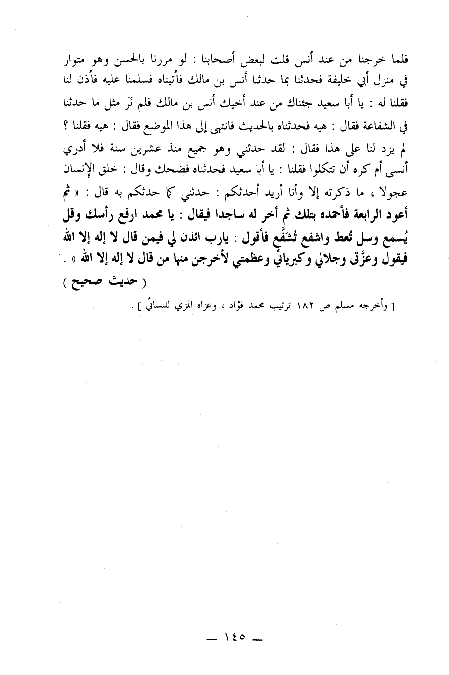 فَلَمَّا خَرَجْنَا مِنْ عِنْدِ أَنَسٍ قُلْتُ لِبَعْضِ أَصْحَابِنَا: لَوْ مَرَرْنَا بِالْحَسَنِ وَهُوَ مُتَوَارٍ فِي مَنْزِلِ أَبِي خَلِيفَةَ فَحَدَّثْنَاهُ بِمَا حَدَّثَنَا أَنَسُ بْنُ مَالِكٍ فَأَتَيْنَاهُ فَسَلَّمْنَا عَلَيْهِ فَأَذِنَ لَنَا فَقُلْنَا لَهُ: يَا أَبَا سَعِيدٍ جِئْنَاكَ مِنْ عِنْدِ أَخِيكَ أَنَسِ بْنِ مَالِكٍ فَلَمْ نَرَ مِثْلَ مَا حَدَّثَنَا فِي الشَّفَاعَةِ, فَقَالَ: هِيهْ, فَحَدَّثْنَاهُ بِالْحَدِيثِ فَانْتَهَى إِلَى هَذَا الْمَوْضِع, ِ فَقَالَ: هِيهْ, فَقُلْنَا: لَمْ يَزِدْ لَنَا عَلَى هَذَا فَقَالَ: لَقَدْ حَدَّثَنِي وَهُوَ جَمِيعٌ مُنْذُ عِشْرِينَ سَنَةً فَلَا أَدْرِي أَنَسِيَ أَمْ كَرِهَ أَنْ تَتَّكِلُوا, قُلْنَا: يَا أَبَا سَعِيدٍ فَحَدِّثْنَا, فَضَحِكَ، وَقَالَ: خُلِقَ الْإِنْسَانُ عَجُولاً، مَا ذَكَرْتُهُ إِلَّا وَأَنَا أُرِيدُ أَنْ أُحَدِّثَكُمْ، حَدَّثَنِي كَمَا حَدَّثَكُمْ بِهِ قَالَ: ((ثُمَّ أَعُودُ الرَّابِعَةَ فَأَحْمَدُهُ بِتِلْكَ الْمَحَامِدِ ثُمَّ أَخِرُّ لَهُ سَاجِدًا فَيُقَالُ: يَا مُحَمَّدُ ارْفَعْ رَأْسَكَ، وَقُلْ يُسْمَعْ، وَسَلْ تُعْطَهْ، وَاشْفَعْ تُشَفَّعْ، فَأَقُولُ: يَا رَبِّ ائْذَنْ لِي فِيمَنْ قَالَ: لَا إِلَهَ إِلَّا اللَّهُ، فَيَقُولُ: وَعِزَّتِي وَجَلَالِي وَكِبْرِيَائِي وَعَظَمَتِي لَأُخْرِجَنَّ مِنْهَا مَنْ قَالَ لَا إِلَهَ إِلَّا اللَّهُ)) .