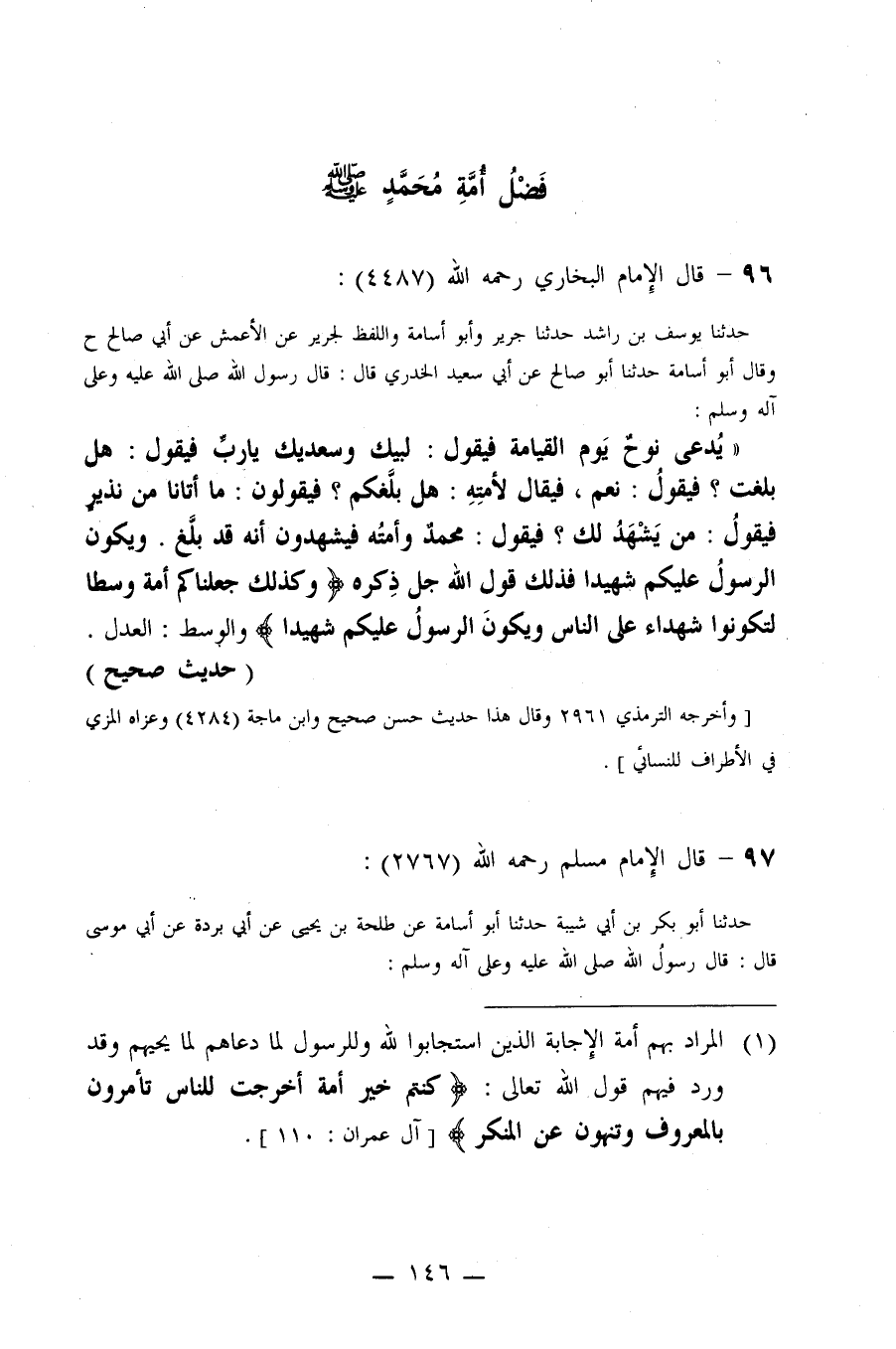 86- عَنْ أَبِي سَعِيدٍ الْخُدْرِيِّ (قَالَ: قَالَ رَسُولُ اللَّهِ صلى الله عليه وسلم: ((يُدْعَى نُوحٌ يَوْمَ الْقِيَامَةِ فَيَقُولُ: لَبَّيْكَ وَسَعْدَيْكَ يَا رَبِّ, فَيَقُولُ: هَلْ بَلَّغْتَ؟ فَيَقُولُ: نَعَمْ، فَيُقَالُ لِأُمَّتِهِ: هَلْ بَلَّغَكُمْ؟ فَيَقُولُونَ: مَا أَتَانَا مِنْ نَذِيرٍ، فَيَقُولُ: مَنْ يَشْهَدُ لَكَ؟ فَيَقُولُ: مُحَمَّدٌ وَأُمَّتُهُ, فَتَشْهَدُونَ أَنَّهُ قَدْ بَلَّغَ -وَيَكُونَ الرَّسُولُ عَلَيْكُمْ شَهِيدًا- فَذَلِكَ قَوْلُهُ جَلَّ ذِكْرُهُ: (وَكَذَلِكَ جَعَلْنَاكُمْ أُمَّةً وَسَطًا لِتَكُونُوا شُهَدَاءَ عَلَى النَّاسِ وَيَكُونَ الرَّسُولُ عَلَيْكُمْ شَهِيدًا (وَالْوَسَطُ الْعَدْلُ)) .