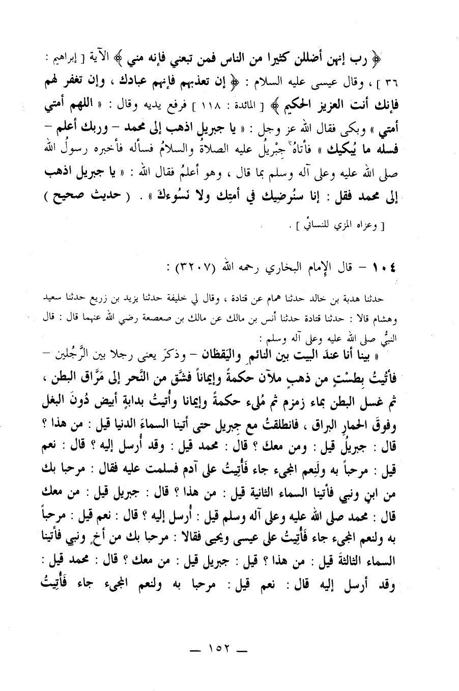 (رَبِّ إِنَّهُنَّ أَضْلَلْنَ كَثِيرًا مِنْ النَّاسِ فَمَنْ تَبِعَنِي فَإِنَّهُ مِنِّي (الْآيَةَ, وَقَالَ عِيسَى عَلَيْهِ السَّلَام: (إِنْ تُعَذِّبْهُمْ فَإِنَّهُمْ عِبَادُكَ وَإِنْ تَغْفِرْ لَهُمْ فَإِنَّكَ أَنْتَ الْعَزِيزُ الْحَكِيمُ (، فَرَفَعَ يَدَيْهِ وَقَالَ: ((اللَّهُمَّ أُمَّتِي أُمَّتِي)) وَبَكَى، فَقَالَ اللَّهُ عَزَّ وَجَلَّ: ((يَا جِبْرِيلُ اذْهَبْ إِلَى مُحَمَّدٍ -وَرَبُّكَ أَعْلَمُ- فَسَلْهُ مَا يُبْكِيكَ، فَأَتَاهُ جِبْرِيلُ عَلَيْهِ السَّلَام فَسَأَلَهُ فَأَخْبَرَهُ رَسُولُ اللَّهِ صلى الله عليه وسلم بِمَا قَالَ: وَهُوَ أَعْلَمُ, فَقَالَ اللَّهُ: يَا جِبْرِيلُ اذْهَبْ إِلَى مُحَمَّدٍ فَقُلْ: إِنَّا سَنُرْضِيكَ فِي أُمَّتِكَ وَلَا نَسُوءُكَ)) .