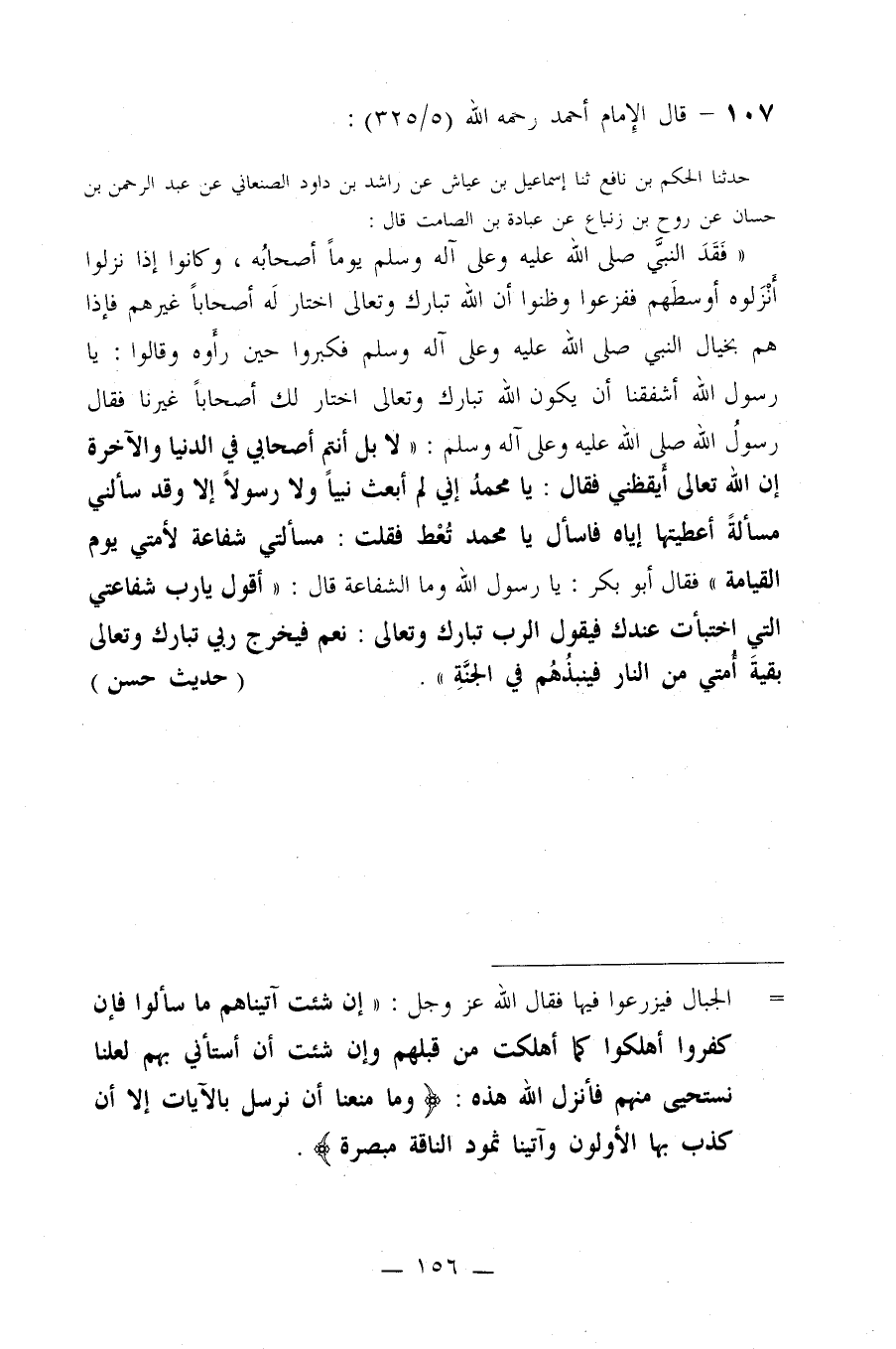 97- عَنْ عُبَادَةَ بْنِ الصَّامِتِ (قَالَ: فَقَدَ النَّبِيَّ صلى الله عليه وسلم لَيْلَةً أَصْحَابُهُ، وَكَانُوا إِذَا نَزَلُوا أَنْزَلُوهُ أَوْسَطَهُمْ فَفَزِعُوا، وَظَنُّوا أَنَّ اللَّهَ -تَبَارَكَ وَتَعَالَى- اخْتَارَ لَهُ أَصْحَابًا غَيْرَهُمْ، فَإِذَا هُمْ بِخَيَالِ النَّبِيِّ صلى الله عليه وسلم فَكَبَّرُوا حِينَ رَأَوْهُ قَالُوا: يَا رَسُولَ اللَّهِ أَشْفَقْنَا أَنْ يَكُونَ اللَّهُ -تَبَارَكَ وَتَعَالَى- اخْتَارَ لَكَ أَصْحَابًا غَيْرَنَا، فَقَالَ رَسُولُ اللَّهِ صلى الله عليه وسلم: ((لَا، بَلْ أَنْتُمْ أَصْحَابِي فِي الدُّنْيَا وَالْآخِرَةِ إِنَّ اللَّهَ تَعَالَى أَيْقَظَنِي فَقَالَ: يَا مُحَمَّدُ إِنِّي لَمْ أَبْعَثْ نَبِيًّا وَلَا رَسُولاً إِلَّا وَقَدْ سَأَلَنِي مَسْأَلَةً أَعْطَيْتُهَا إِيَّاهُ فَاسْأَلْ يَا مُحَمَّدُ تُعْطَ. فَقُلْتُ: مَسْأَلَتِي شَفَاعَةٌ لِأُمَّتِي يَوْمَ الْقِيَامَةِ)) , فَقَالَ أَبُو بَكْرٍ: يَا رَسُولَ اللَّهِ صلى الله عليه وسلم وَمَا الشَّفَاعَةُ؟ قَالَ: ((أَقُولُ: يَا رَبِّ شَفَاعَتِي الَّتِي اخْتَبَأْتُ عِنْدَكَ فَيَقُولُ الرَّبُّ تَبَارَكَ وَتَعَالَى: نَعَمْ فَيُخْرِجُ رَبِّي -تَبَارَكَ وَتَعَالَى- بَقِيَّةَ أُمَّتِي مِنْ النَّارِ فَيَنْبِذُهُمْ فِي الْجَنَّةِ)) .