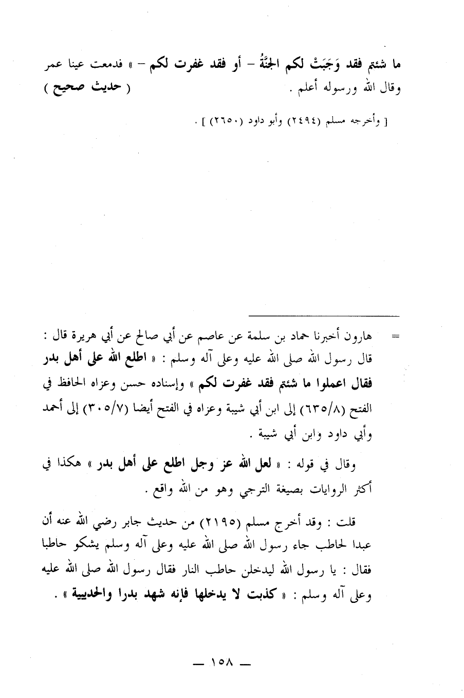 مَا شِئْتُمْ فَقَدْ وَجَبَتْ لَكُمْ الْجَنَّةُ -أَوْ فَقَدْ غَفَرْتُ لَكُمْ-)) . فَدَمَعَتْ عَيْنَا عُمَرَ وَقَالَ: اللَّهُ وَرَسُولُهُ أَعْلَمُ.