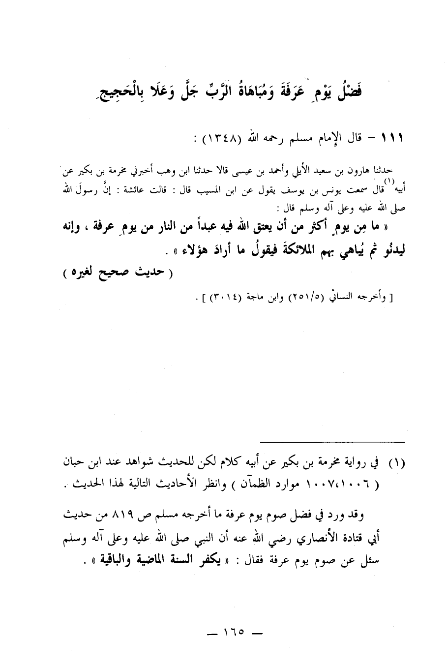 100- قَالَتْ عَائِشَةُ -رضى الله عنها- إِنَّ رَسُولَ اللَّهِ صلى الله عليه وسلم قَالَ: ((مَا مِنْ يَوْمٍ أَكْثَرَ مِنْ أَنْ يُعْتِقَ اللَّهُ فِيهِ عَبْدًا مِنْ النَّارِ مِنْ يَوْمِ عَرَفَةَ، وَإِنَّهُ لَيَدْنُو ثُمَّ يُبَاهِي بِهِمْ الْمَلَائِكَةَ فَيَقُولُ: مَا أَرَادَ هَؤُلَاءِ)) .