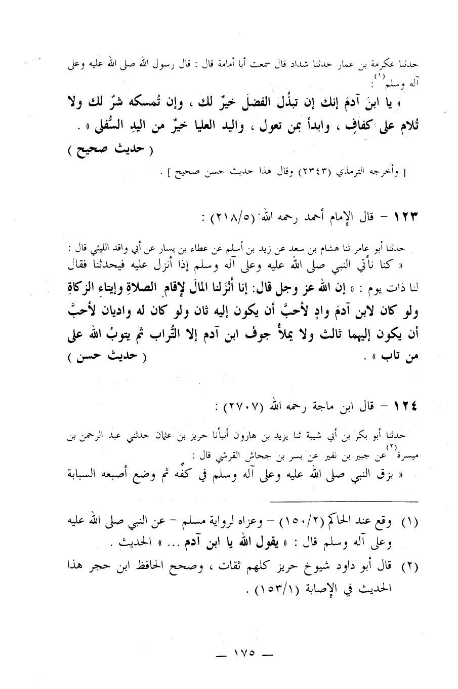 110- عَنْ أَبِي وَاقِدٍ اللَّيْثِيِّ قَالَ: كُنَّا نَأْتِي النَّبِيَّ صلى الله عليه وسلم إِذَا أُنْزِلَ عَلَيْهِ فَيُحَدِّثُنَا، فَقَالَ لَنَا ذَاتَ يَوْمٍ: ((إِنَّ اللَّهَ -عَزَّ وَجَلَّ- قَالَ: إِنَّا أَنْزَلْنَا الْمَالَ لِإِقَامِ الصَّلَاةِ وَإِيتَاءِ الزَّكَاةِ، وَلَوْ كَانَ لِابْنِ آدَمَ وَادٍ لَأَحَبَّ أَنْ يَكُونَ إِلَيْهِ ثَانٍ، وَلَوْ كَانَ لَهُ وَادِيَانِ لَأَحَبَّ أَنْ يَكُونَ إِلَيْهِمَا ثَالِثٌ، وَلَا يَمْلَأُ جَوْفَ ابْنِ آدَمَ إِلَّا التُّرَابُ، ثُمَّ يَتُوبُ اللَّهُ عَلَى مَنْ تَابَ)) .
