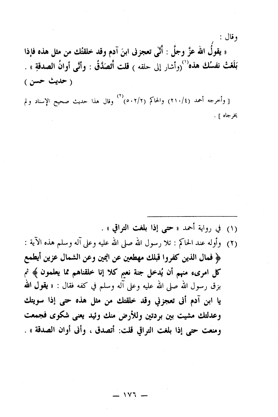 ((يَقُولُ اللَّهُ عَزَّ وَجَلَّ: أَنَّى تُعْجِزُنِي ابْنَ آدَمَ، وَقَدْ خَلَقْتُكَ مِنْ مِثْلِ هَذِهِ فَإِذَا بَلَغَتْ نَفْسُكَ هَذِهِ (وَأَشَارَ إِلَى حَلْقِه) ِ قُلْتَ: أَتَصَدَّقُ: وَأَنَّى أَوَانُ الصَّدَقَةِ)) .