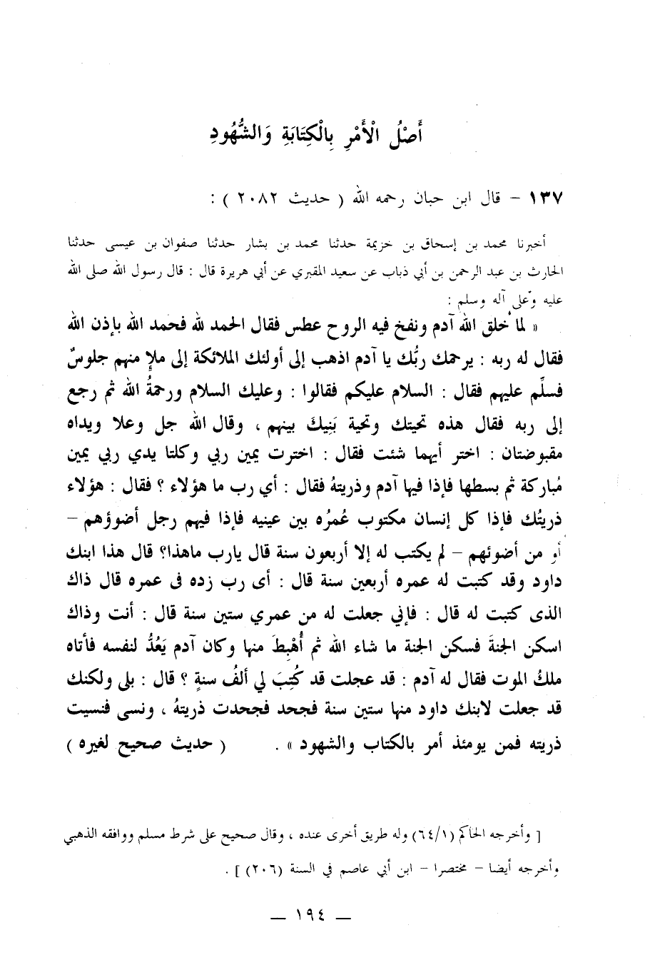 124- عَنْ أَبِي هُرَيْرَةَ (قَالَ: قَالَ رَسُولُ اللَّهِ صلى الله عليه وسلم: ((لَمَّا خَلَقَ اللَّهُ آدَمَ وَنَفَخَ فِيهِ الرُّوحَ عَطَسَ فَقَالَ: الْحَمْدُ لِلَّهِ، فَحَمِدَ اللَّهَ بِإِذْنِهِ فَقَالَ لَهُ رَبُّهُ: يَرْحَمُكَ ربك يَا آدَمُ، اذْهَبْ إِلَى أُولَئِكَ الْمَلَائِكَةِ إِلَى مَلَإٍ مِنْهُمْ جُلُوسٍ فسلم عليهم, فقال: السَّلَامُ عَلَيْكُمْ، فقَالُوا: وَعَلَيْكَ السَّلَامُ وَرَحْمَةُ اللَّهِ، ثُمَّ رَجَعَ إِلَى رَبِّهِ فَقَالَ: هَذِهِ تَحِيَّتُكَ وَتَحِيَّةُ بَنِيكَ بَيْنَهُمْ، وقَالَ اللَّهُ -جلا وعلا- وَيَدَاهُ مَقْبُوضَتَانِ: اخْتَرْ أَيَّهُمَا شِئْتَ قَالَ: اخْتَرْتُ يَمِينَ رَبِّي وَكِلْتَا يَدَيْ رَبِّي يَمِينٌ مُبَارَكَةٌ ثُمَّ بَسَطَهَا فَإِذَا فِيهَا آدَمُ وَذُرِّيَّتُهُ فَقَالَ: أَيْ رَبِّ: مَا هَؤُلَاءِ؟ فَقَالَ: هَؤُلَاءِ ذُرِّيَّتُكَ فَإِذَا كُلُّ إِنْسَانٍ مَكْتُوبٌ عُمْرُهُ بَيْنَ عَيْنَيْهِ فَإِذَا فِيهِمْ رَجُلٌ أَضْوَؤُهُمْ -أَوْ مِنْ أَضْوَئِهِمْ لَمْ يُكْتَبْ لَهُ إلَّا أَربَعُونَ سَنَةٍ- قَالَ: يَا رَبِّ مَنْ هَذَا؟ قَالَ: هَذَا ابْنُكَ دَاوُدُ وقَدْ كَتَبْتُ لَهُ عُمْرَ أَرْبَعِينَ سَنَة، ً قَالَ: أي رَبِّ زِدْهُ فِي عُمْرِهِ, قَالَ: ذَاكَ الَّذِي كَتَبْتُ لَهُ، قَالَ: أَيْ رَبِّ فَإِنِّي قَدْ جَعَلْتُ لَهُ مِنْ عُمْرِي سِتِّينَ سَنَةً قَالَ: أَنْتَ وَذَاكَ، أُسْكِنَ الْجَنَّةَ مَا شَاءَ اللَّهُ، ثُمَّ أُهْبِطَ مِنْهَا فَكَانَ آدَمُ يَعُدُّ لِنَفْسِهِ، قَالَ: فَأَتَاهُ مَلَكُ الْمَوْتِ فَقَالَ لَهُ آدَمُ: قَدْ عَجَّلْتَ، قَدْ كُتِبَ لِي أَلْفُ سَنَةٍ؟ قَالَ: بَلَى وَلَكِنَّكَ قد جَعَلْتَ لِابْنِكِ دَاوُدَ منها سِتِّينَ سَنَةً، فَجَحَدَ فَجَحَدَتْ ذُرِّيَّتُهُ، وَنَسِيَ فَنَسِيَتْ ذُرِّيَّتُهُ، قَالَ: فَمِنْ يَوْمِئِذٍ أُمِرَ بِالْكِتَابِ وَالشُّهُودِ)) .