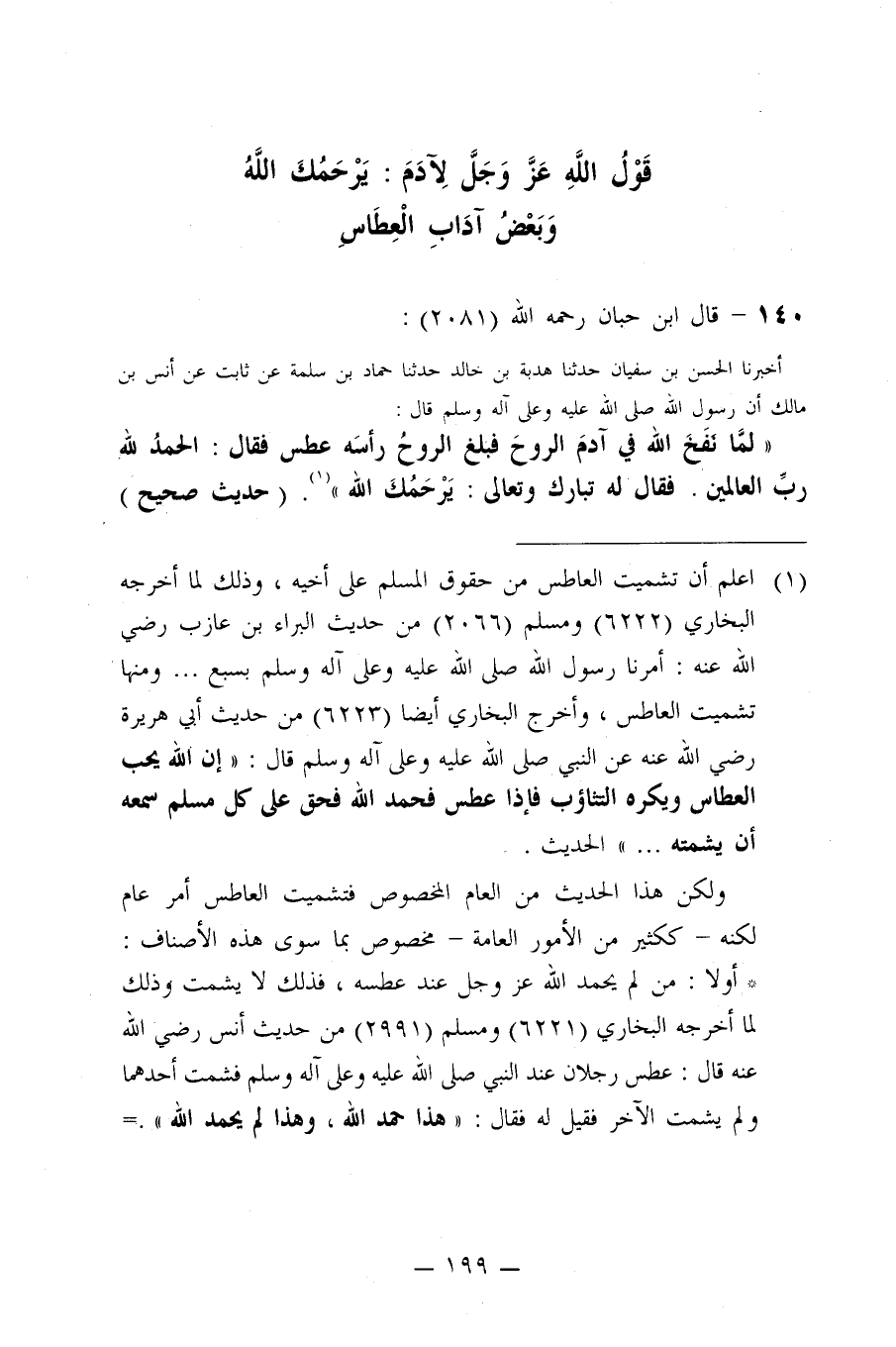 125- عن أنس بن مالك رضي الله عنه أن رسول الله صلى الله عليه وسلم قال: ((لمَّا نَفَخَ الله في آدَمْ الرُوْح فَبَلَغَ الرُوحْ رَأْسَهُ عَطَسْ فَقَاَلَ: الحمدُ لله رَبِّ العَالَمِيْن. فَقَاَلَ له تَبَاركْ وتعالى: يَرْحَمُكَ الله)) .