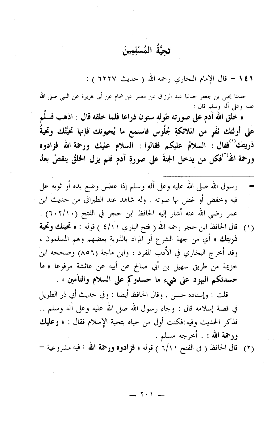 126- عَنْ أَبِي هُرَيْرَةَ (عَنْ النَّبِيِّ صلى الله عليه وسلم قَالَ: ((خَلَقَ اللَّهُ آدَمَ عَلَى صُورَتِهِ طُولُهُ سِتُّونَ ذِرَاعًا، فَلَمَّا خَلَقَهُ قَالَ: اذْهَبْ فَسَلِّمْ عَلَى أُولَئِكَ النَّفَرِ مِنْ الْمَلَائِكَةِ جُلُوسٌ، فَاسْتَمِعْ مَا يُحَيُّونَكَ؛ فَإِنَّهَا تَحِيَّتُكَ وَتَحِيَّةُ ذُرِّيَّتِكَ, فَقَالَ: السَّلَامُ عَلَيْكُمْ, فَقَالُوا: السَّلَامُ عَلَيْكَ وَرَحْمَةُ اللَّهِ، فَزَادُوهُ وَرَحْمَةُ اللَّهِ، فَكُلُّ مَنْ يَدْخُلُ الْجَنَّةَ عَلَى صُورَةِ آدَمَ فَلَمْ يَزَلْ الْخَلْقُ يَنْقُصُ بَعْدُ