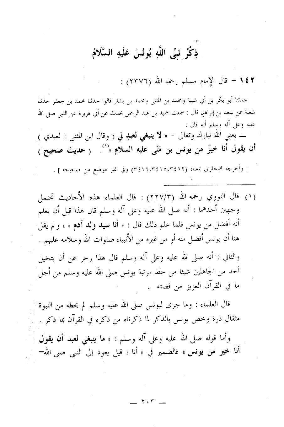 127- عَنْ أَبِي هُرَيْرَةَ (عَنْ النَّبِيِّ صلى الله عليه وسلم أَنَّهُ قَالَ- يَعْنِي: اللَّهَ تَبَارَكَ وَتَعَالَى-: ((لَا يَنْبَغِي لِي (وقَالَ ابْنُ الْمُثَنَّى: لِعَبْدِي) أَنْ يَقُولَ: أَنَا خَيْرٌ مِنْ يُونُسَ بْنِ مَتَّى عَلَيْهِ السَّلَام)) .