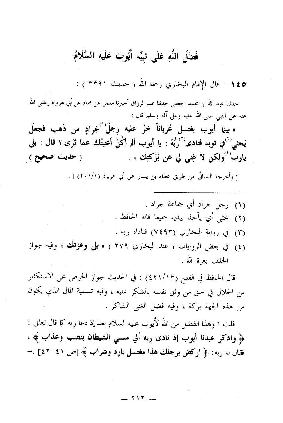 130- عَنْ أَبِي هُرَيْرَةَ (عَنْ النَّبِيِّ صلى الله عليه وسلم قَالَ: ((بَيْنَمَا أَيُّوبُ يَغْتَسِلُ عُرْيَانًا خَرَّ عَلَيْهِ رِجْلُ جَرَادٍ مِنْ ذَهَبٍ فَجَعَلَ يَحْثِي فِي ثَوْبِهِ فَنَادَاهُ رَبُّهُ: يَا أَيُّوبُ أَلَمْ أَكُنْ أَغْنَيْتُكَ عَمَّا تَرَى؟ قَالَ: بَلَى يَا رَبِّ وَلَكِنْ لَا غِنَى لِي عَنْ بَرَكَتِكَ)) .
