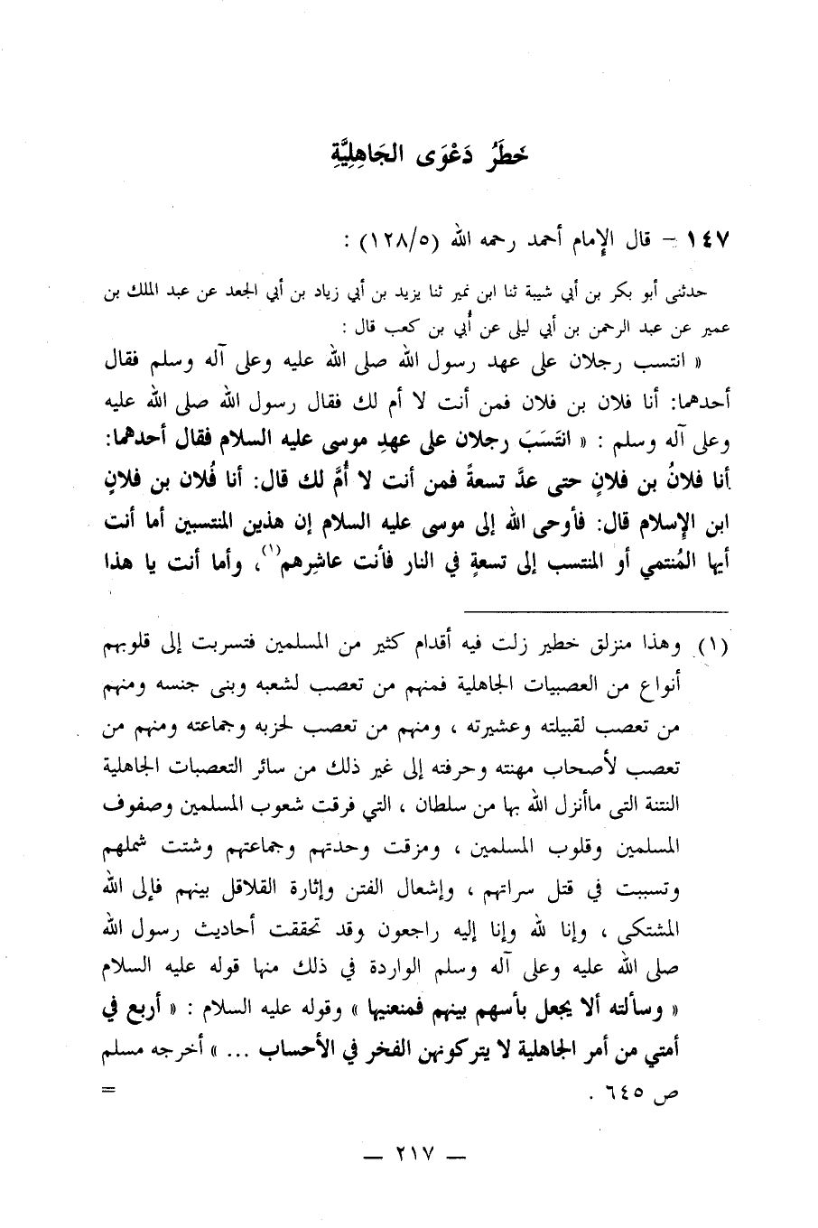 131 عَنْ أُبَيِّ بْنِ كَعْبٍ (قَالَ: انْتَسَبَ رَجُلَانِ عَلَى عَهْدِ رَسُولِ اللَّهِ صلى الله عليه وسلم فَقَالَ أَحَدُهُمَا: أَنَا فُلَانُ بْنُ فُلَانٍ فَمَنْ أَنْتَ لَا أُمَّ لَكَ، فَقَالَ رَسُولُ اللَّهِ صلى الله عليه وسلم: ((انْتَسَبَ رَجُلَانِ عَلَى عَهْدِ مُوسَى -عَلَيْهِ السَّلَام- فَقَالَ أَحَدُهُمَا: أَنَا فُلَانُ بْنُ فُلَانٍ حَتَّى عَدَّ تِسْعَةً فَمَنْ أَنْتَ لَا أُمَّ لَكَ، قَالَ: أَنَا فُلَانُ بْنُ فُلَانٍ ابْنُ الْإِسْلَامِ. قَالَ: فَأَوْحَى اللَّهُ إِلَى مُوسَى -عَلَيْهِ السَّلَام-: أَنَّ هَذَيْنِ الْمُنْتَسِبَيْنِ أَمَّا أَنْتَ أَيُّهَا الْمُنْتَمِي أَوْ الْمُنْتَسِبُ إِلَى تِسْعَةٍ فِي النَّارِ فَأَنْتَ عَاشِرُهُمْ، وَأَمَّا أَنْتَ يَا هَذَا
