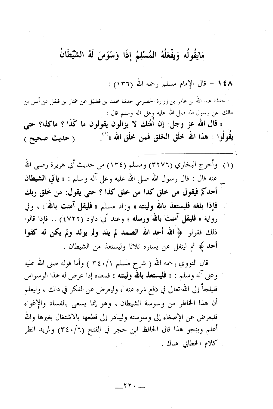 132- عَنْ أَنَسِ بْنِ مَالِكٍ (عَنْ رَسُولِ اللَّهِ صلى الله عليه وسلم قَالَ: ((قَالَ اللَّهُ عَزَّ وَجَلَّ: إِنَّ أُمَّتَكَ لَا يَزَالُونَ يَقُولُونَ: مَا كَذَا؟ مَا كَذَا؟ حَتَّى يَقُولُوا: هَذَا اللَّهُ خَلَقَ الْخَلْقَ فَمَنْ خَلَقَ اللَّهَ؟))