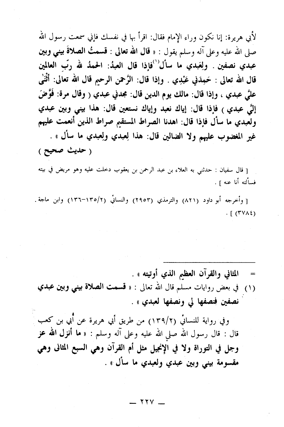 ((قَالَ اللَّهُ تَعَالَى: قَسَمْتُ الصَّلَاةَ بَيْنِي وَبَيْنَ عَبْدِي نِصْفَيْنِ وَلِعَبْدِي مَا سَأَلَ, فَإِذَا قَالَ الْعَبْدُ: الْحَمْدُ لِلَّهِ رَبِّ الْعَالَمِينَ، قَالَ اللَّهُ تَعَالَى: حَمِدَنِي عَبْدِي. وَإِذَا قَالَ: الرَّحْمَنِ الرَّحِيمِ، قَالَ اللَّهُ تَعَالَى: أَثْنَى عَلَيَّ عَبْدِي. وَإِذَا قَالَ: مَالِكِ يَوْمِ الدِّينِ قَالَ: مَجَّدَنِي عَبْدِي (وَقَالَ مَرَّةً: فَوَّضَ إِلَيَّ عَبْدِي) فَإِذَا قَالَ: إِيَّاكَ نَعْبُدُ وَإِيَّاكَ نَسْتَعِينُ قَالَ: هَذَا بَيْنِي وَبَيْنَ عَبْدِي وَلِعَبْدِي مَا سَأَلَ, فَإِذَا قَالَ: اهْدِنَا الصِّرَاطَ الْمُسْتَقِيمَ صِرَاطَ الَّذِينَ أَنْعَمْتَ عَلَيْهِمْ غَيْرِ الْمَغْضُوبِ عَلَيْهِمْ وَلَا الضَّالِّينَ, قَالَ: هَذَا لِعَبْدِي وَلِعَبْدِي مَا سَأَلَ)) .