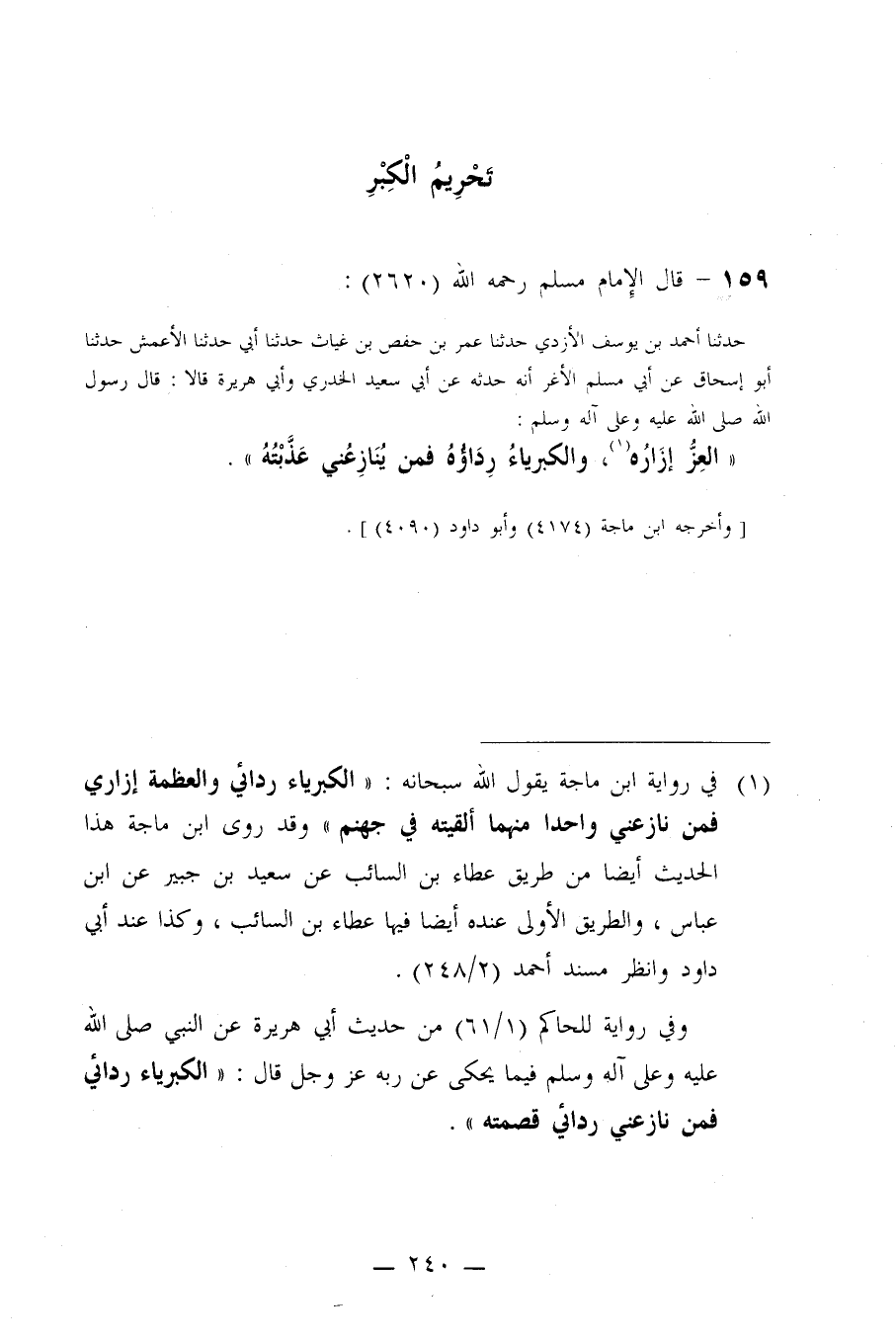 140- عَنْ أَبِي سَعِيدٍ الْخُدْرِيِّ وَأَبِي هُرَيْرَةَ -رضي الله عنهما- قَالَا: قَالَ رَسُولُ اللَّهِ صلى الله عليه وسلم: ((الْعِزُّ إِزَارُهُ وَالْكِبْرِيَاءُ رِدَاؤُهُ فَمَنْ يُنَازِعُنِي عَذَّبْتُهُ)) .