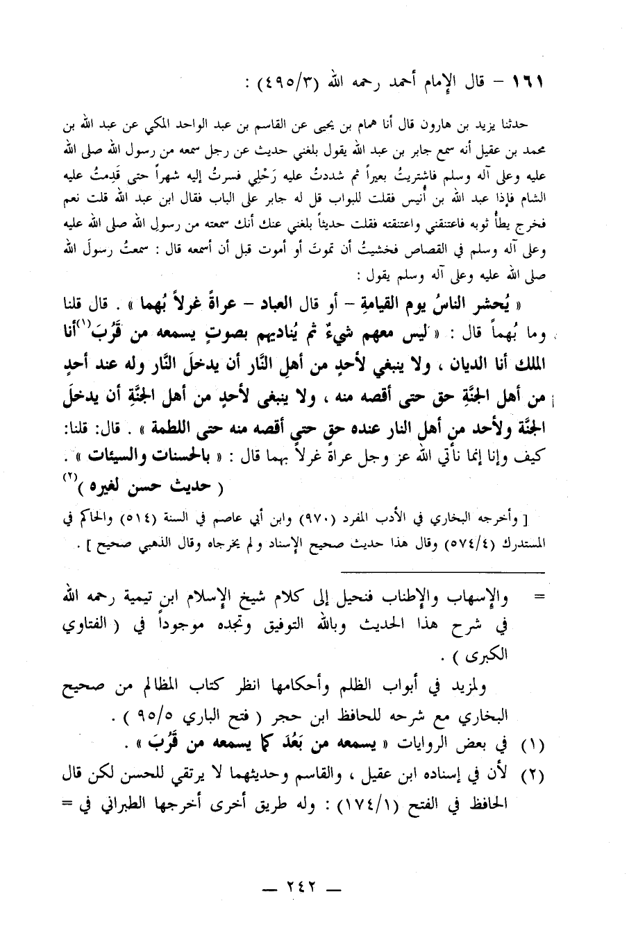 فَقُلْتُ لِلْبَوَّابِ: قُلْ لَهُ: جَابِرٌ عَلَى الْبَابِ، فَقَالَ: ابْنُ عَبْدِ اللَّهِ؟ قُلْتُ: نَعَمْ. فَخَرَجَ يَطَأُ ثَوْبَهُ فَاعْتَنَقَنِي وَاعْتَنَقْتُهُ فَقُلْتُ: حَدِيثًا بَلَغَنِي عَنْكَ أَنَّكَ سَمِعْتَهُ مِنْ رَسُولِ اللَّهِ صلى الله عليه وسلم فِي الْقِصَاصِ فَخَشِيتُ أَنْ تَمُوتَ أَوْ أَمُوتَ قَبْلَ أَنْ أَسْمَعَهُ, قَالَ: سَمِعْتُ رَسُولَ اللَّهِ صلى الله عليه وسلم يَقُولُ: ((يُحْشَرُ النَّاسُ يَوْمَ الْقِيَامَةِ -أَوْ قَالَ: الْعِبَادُ- عُرَاةً غُرْلاً بُهْمًا)) ، قَالَ: قُلْنَا: وَمَا بُهْمًا؟ قَالَ: ((لَيْسَ مَعَهُمْ شَيْءٌ ثُمَّ يُنَادِيهِمْ بِصَوْتٍ يَسْمَعُهُ مِنْ قُرْبٍ: أَنَا الْمَلِكُ أَنَا الدَّيَّانُ, وَلَا يَنْبَغِي لِأَحَدٍ مِنْ أَهْلِ النَّارِ أَنْ يَدْخُلَ النَّارَ وَلَهُ عِنْدَ أَحَدٍ مِنْ أَهْلِ الْجَنَّةِ حَقٌّ حَتَّى أَقُصَّهُ مِنْهُ, وَلَا يَنْبَغِي لِأَحَدٍ مِنْ أَهْلِ الْجَنَّةِ أَنْ يَدْخُلَ الْجَنَّةَ، وَلِأَحَدٍ مِنْ أَهْلِ النَّارِ عِنْدَهُ حَقٌّ حَتَّى أَقُصَّهُ مِنْهُ حَتَّى اللَّطْمَةُ)) ، قَالَ: قُلْنَا: كَيْفَ وَإِنَّا إِنَّمَا نَأْتِي اللَّهَ -عَزَّ وَجَلَّ- عُرَاةً غُرْلاً بُهْمًا؟ قَالَ: ((بِالْحَسَنَاتِ وَالسَّيِّئَاتِ)) .