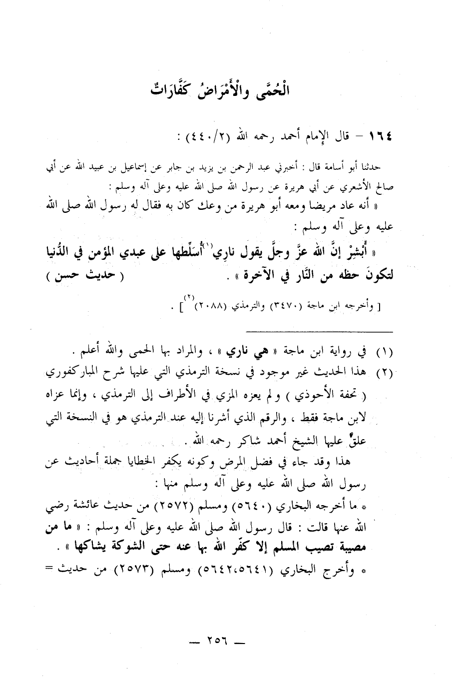 145- عَنْ أَبِي هُرَيْرَةَ (عَنْ رَسُولُ اللَّه صلى الله عليه وسلم: أَنَّهُ عَادَ مَرِيضًا -وَمَعَهُ أَبُو هُرَيْرَةَ- مِنْ وَعْكٍ كَانَ بِهِ فَقَالَ لَهُ رَسُولُ اللَّهِ صلى الله عليه وسلم: ((أَبْشِرْ إِنَّ اللَّهَ يَقُولُ: نَارِي أُسَلِّطُهَا عَلَى عَبْدِي الْمُؤْمِنِ فِي الدُّنْيَا لِتَكُونَ حَظَّهُ مِنْ النَّارِ فِي الْآخِرَةِ)) .