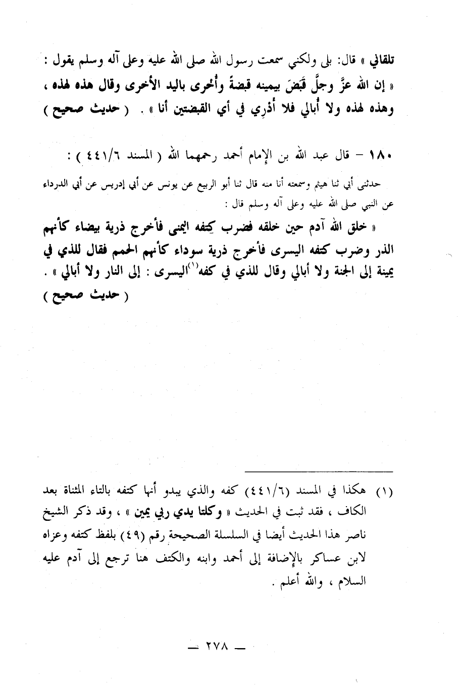 160- عَنْ أَبِي الدَّرْدَاءِ (عَنْ النَّبِيِّ صلى الله عليه وسلم قَالَ: ((خَلَقَ اللَّهُ آدَمَ حِينَ خَلَقَهُ، فَضَرَبَ كَتِفَهُ الْيُمْنَى، فَأَخْرَجَ ذُرِّيَّةً بَيْضَاءَ كَأَنَّهُمْ الذَّرُّ، وَضَرَبَ كَتِفَهُ الْيُسْرَى، فَأَخْرَجَ ذُرِّيَّةً سَوْدَاءَ. كَأَنَّهُمْ الْحُمَمُ، فَقَالَ لِلَّذِي فِي يَمِينِهِ: إِلَى الْجَنَّةِ وَلَا أُبَالِي، وَقَالَ لِلَّذِي فِي كَفِّهِ الْيُسْرَى: إِلَى النَّارِ وَلَا أُبَالِي)) .