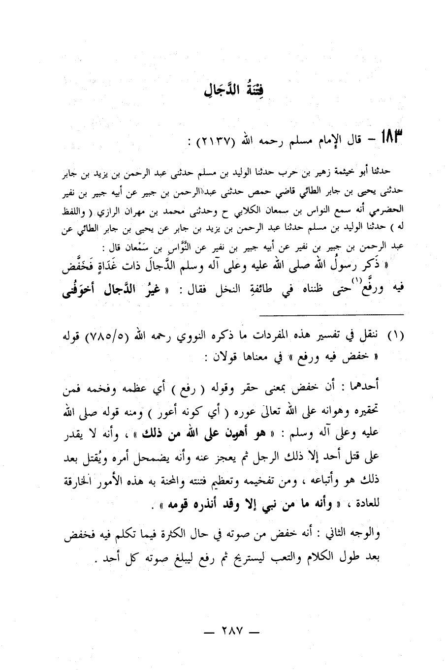 163- عَنْ النَّوَّاسِ بْنِ سَمْعَانَ (قَالَ: ذَكَرَ رَسُولُ اللَّهِ صلى الله عليه وسلم الدَّجَّالَ ذَاتَ غَدَاةٍ فَخَفَّضَ فِيهِ وَرَفَّعَ حَتَّى ظَنَنَّاهُ فِي طَائِفَةِ النَّخْلِ فَقَالَ: ((غَيْرُ الدَّجَّالِ أَخْوَفُنِي