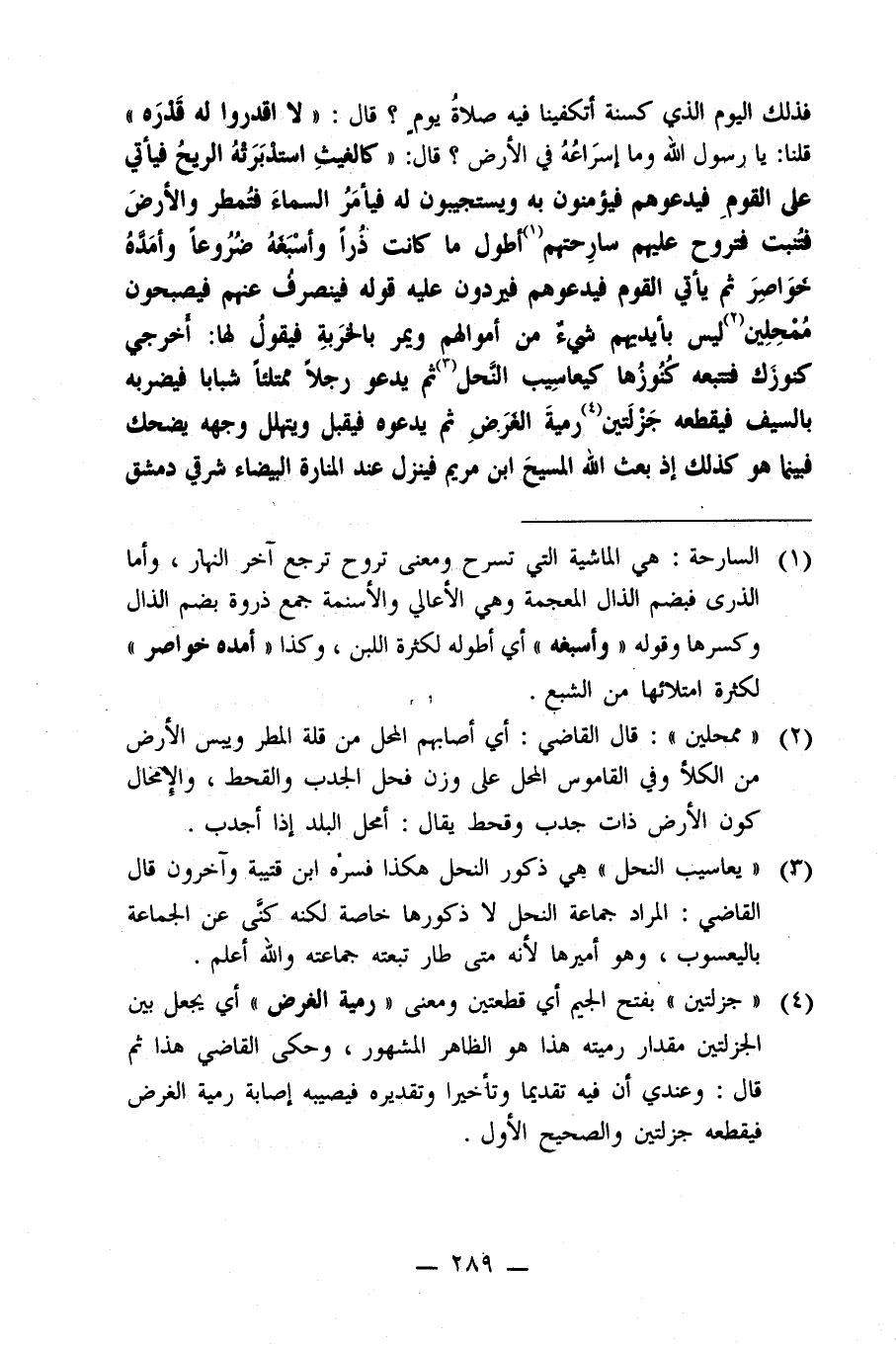 فَذَلِكَ الْيَوْمُ الَّذِي كَسَنَةٍ أَتَكْفِينَا فِيهِ صَلَاةُ يَوْمٍ؟ قَالَ: ((لَا، اقْدُرُوا لَهُ قَدْرَهُ)) ، قُلْنَا: يَا رَسُولَ اللَّهِ وَمَا إِسْرَاعُهُ فِي الْأَرْضِ؟ قَالَ: ((كَالْغَيْثِ اسْتَدْبَرَتْهُ الرِّيحُ، فَيَأْتِي عَلَى الْقَوْمِ فَيَدْعُوهُمْ فَيُؤْمِنُونَ بِهِ وَيَسْتَجِيبُونَ لَهُ، فَيَأْمُرُ السَّمَاءَ فَتُمْطِرُ وَالْأَرْضَ فَتُنْبِتُ فَتَرُوحُ عَلَيْهِمْ سَارِحَتُهُمْ أَطْوَلَ مَا كَانَتْ ذُرًا، وَأَسْبَغَهُ ضُرُوعًا، وَأَمَدَّهُ خَوَاصِرَ، ثُمَّ يَأْتِي الْقَوْمَ فَيَدْعُوهُمْ فَيَرُدُّونَ عَلَيْهِ قَوْلَهُ فَيَنْصَرِفُ عَنْهُمْ فَيُصْبِحُونَ مُمْحِلِينَ لَيْسَ بِأَيْدِيهِمْ شَيْءٌ مِنْ أَمْوَالِهِم, ْ وَيَمُرُّ بِالْخَرِبَةِ فَيَقُولُ لَهَا: أَخْرِجِي كُنُوزَكِ فَتَتْبَعُهُ كُنُوزُهَا كَيَعَاسِيبِ النَّحْلِ ثُمَّ يَدْعُو رَجُلاً مُمْتَلِئًا شَبَابًا فَيَضْرِبُهُ بِالسَّيْفِ فَيَقْطَعُهُ جَزْلَتَيْنِ رَمْيَةَ الْغَرَضِ ثُمَّ يَدْعُوهُ فَيُقْبِلُ وَيَتَهَلَّلُ وَجْهُهُ يَضْحَكُ، فَبَيْنَمَا هُوَ كَذَلِكَ إِذْ بَعَثَ اللَّهُ الْمَسِيحَ ابْنَ مَرْيَمَ فَيَنْزِلُ عِنْدَ الْمَنَارَةِ الْبَيْضَاءِ شَرْقِيَّ دِمَشْقَ