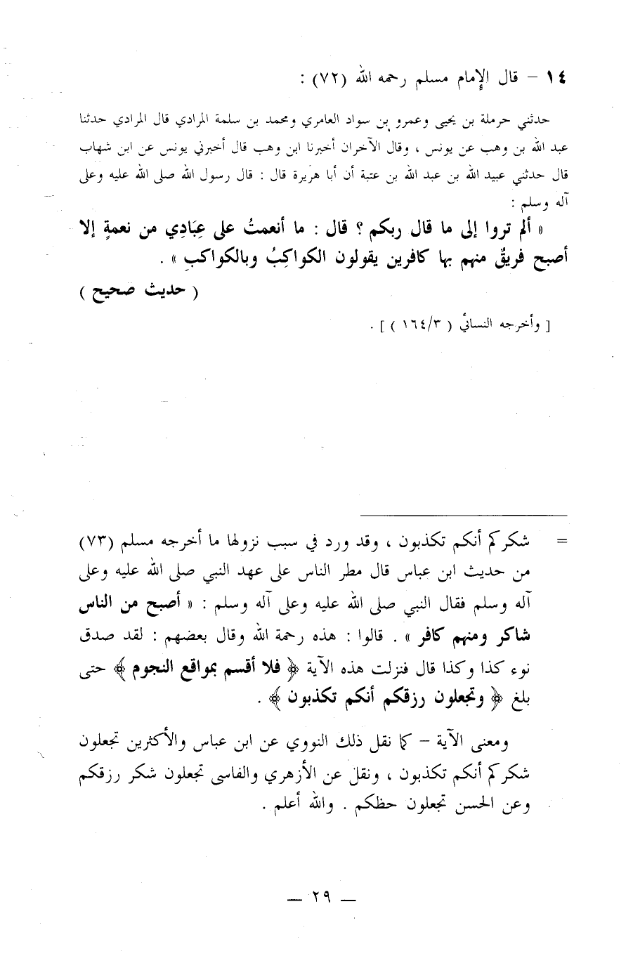 11- عن أبي هريرة -رضي الله عنه- قال: قال رسول الله صلى الله عليه وسلم: ((ألمَ تَرَوْا ما قال ربُّكم؟ قال: ما أنعَمْتُ على عبادي من نعمةٍ إلا أصْبَح فريقٌ منهم بها كافرين يقولون: الكواكبُ وبالكواكبِ)) .