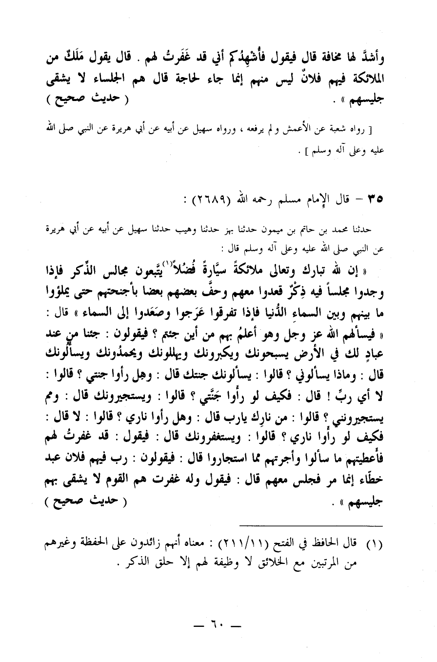 وَأَشَدَّ لَهَا مَخَافَةً، قَالَ: فَيَقُولُ: فَأُشْهِدُكُمْ أَنِّي قَدْ غَفَرْتُ لَهُمْ، قَالَ: يَقُولُ مَلَكٌ مِنْ الْمَلَائِكَةِ: فِيهِمْ فُلَانٌ لَيْسَ مِنْهُمْ إِنَّمَا جَاءَ لِحَاجَةٍ، قَالَ: هُمْ الْجُلَسَاءُ لَا يَشْقَى بِهِمْ جَلِيسُهُمْ)) .