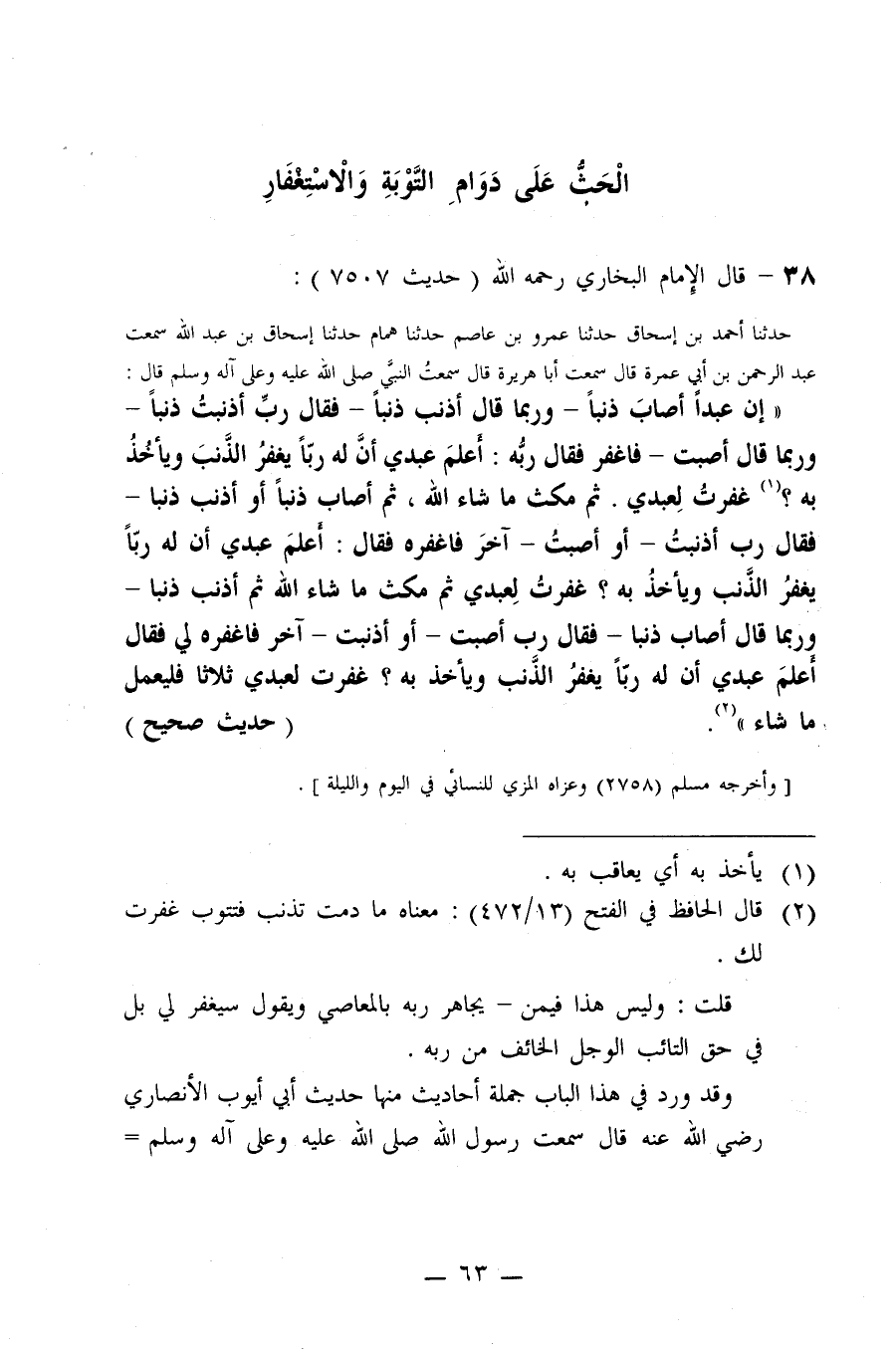 31- عَنْ أَبِي هُرَيْرَةَ (قَالَ: سَمِعْتُ النَّبِيَّ صلى الله عليه وسلم قَالَ: ((إِنَّ عَبْدًا أَصَابَ ذَنْبًا -وَرُبَّمَا قَالَ: أَذْنَبَ ذَنْبًا- فَقَال: َ رَبِّ أَذْنَبْتُ -وَرُبَّمَا قَالَ: أَصَبْتُ فَاغْفِرْ لِي- فَقَالَ: رَبُّهُ أَعَلِمَ عَبْدِي أَنَّ لَهُ رَبًّا يَغْفِرُ الذَّنْبَ وَيَأْخُذُ بِهِ؟ غَفَرْتُ لِعَبْدِي, ثُمَّ مَكَثَ مَا شَاءَ اللَّهُ، ثُمَّ أَصَابَ ذَنْبًا -أَوْ أَذْنَبَ ذَنْبًا- فَقَالَ: رَبِّ أَذْنَبْتُ -أَوْ أَصَبْتُ- آخَرَ فَاغْفِرْهُ. فَقَالَ: أَعَلِمَ عَبْدِي أَنَّ لَهُ رَبًّا يَغْفِرُ الذَّنْبَ وَيَأْخُذُ بِهِ؟ غَفَرْتُ لِعَبْدِي: ثُمَّ مَكَثَ مَا شَاءَ اللَّهُ ثُمَّ أَذْنَبَ ذَنْبًا -وَرُبَّمَا قَالَ: أَصَابَ ذَنْبًا- قَالَ: قَالَ: رَبِّ أَصَبْتُ -أَوْ قَالَ: أَذْنَبْتُ- آخَرَ فَاغْفِرْهُ لِي. فَقَالَ: أَعَلِمَ عَبْدِي أَنَّ لَهُ رَبًّا يَغْفِرُ الذَّنْبَ وَيَأْخُذُ بِهِ؟ غَفَرْتُ لِعَبْدِي ثَلَاثًا فَلْيَعْمَلْ مَا شَاءَ)) .